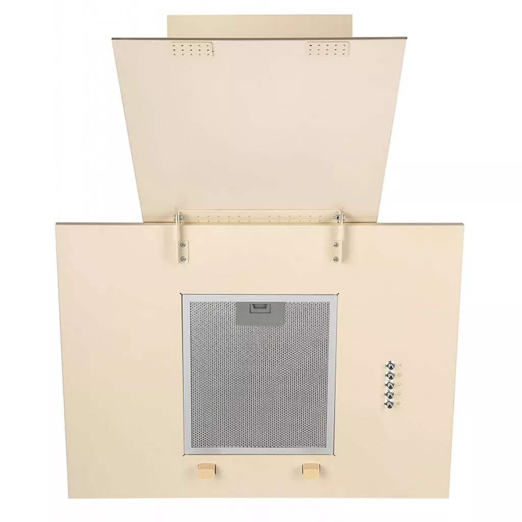 Окрашенный металл в цвет слоновой кости и дверца из закалённого стекла - вытяжки добавляют эстетическую изюминку на кухню. А благодаря необычному горизонтальному/вертикальному расположению дверцы можно гармонично дополнить общий узор кухни.