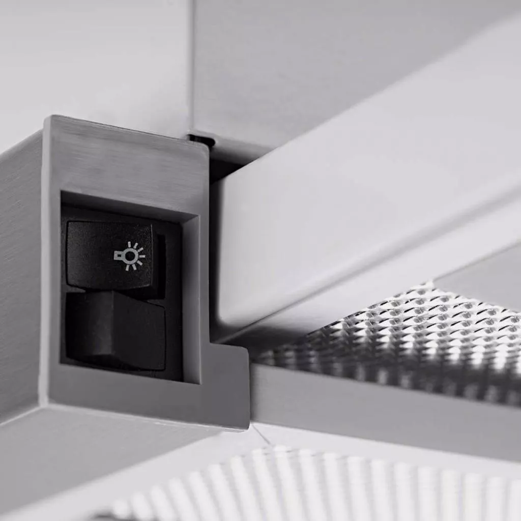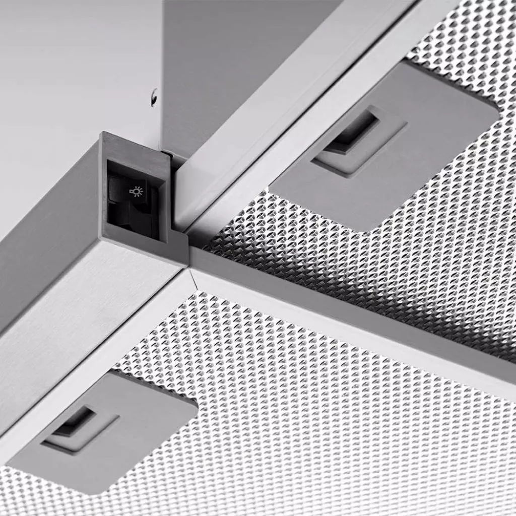 Встраиваемые вытяжки устанавливаются в шкафчик над варочной поверхностью, видимой остается только ручка выдвижного фильтра. Особенность серии TL 1100 – это мощный 200-ваттный мотор.