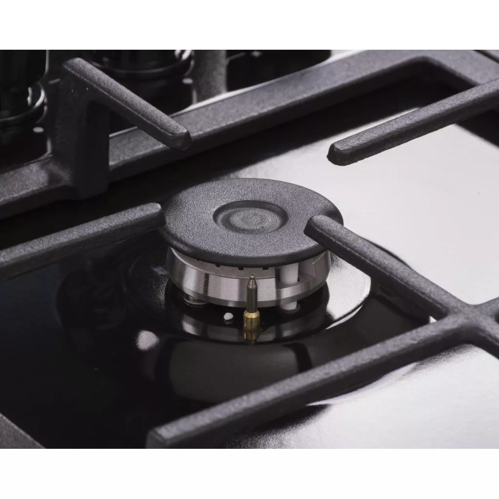 Эта конфорка с тройным пламенем способна равномерно распределять пламя, благодаря чему время готовки значительно сокращается, а продукты сохраняют полезные витамины по максимуму. На этой конфорке удобно использовать посуду большого диаметра или же специальную WOK – посуду. Представляемая варочная поверхность оснащена электроподжигом и газ – контролем всех конфорок. Поворотные ручки управления располагаются на передней панели модели.