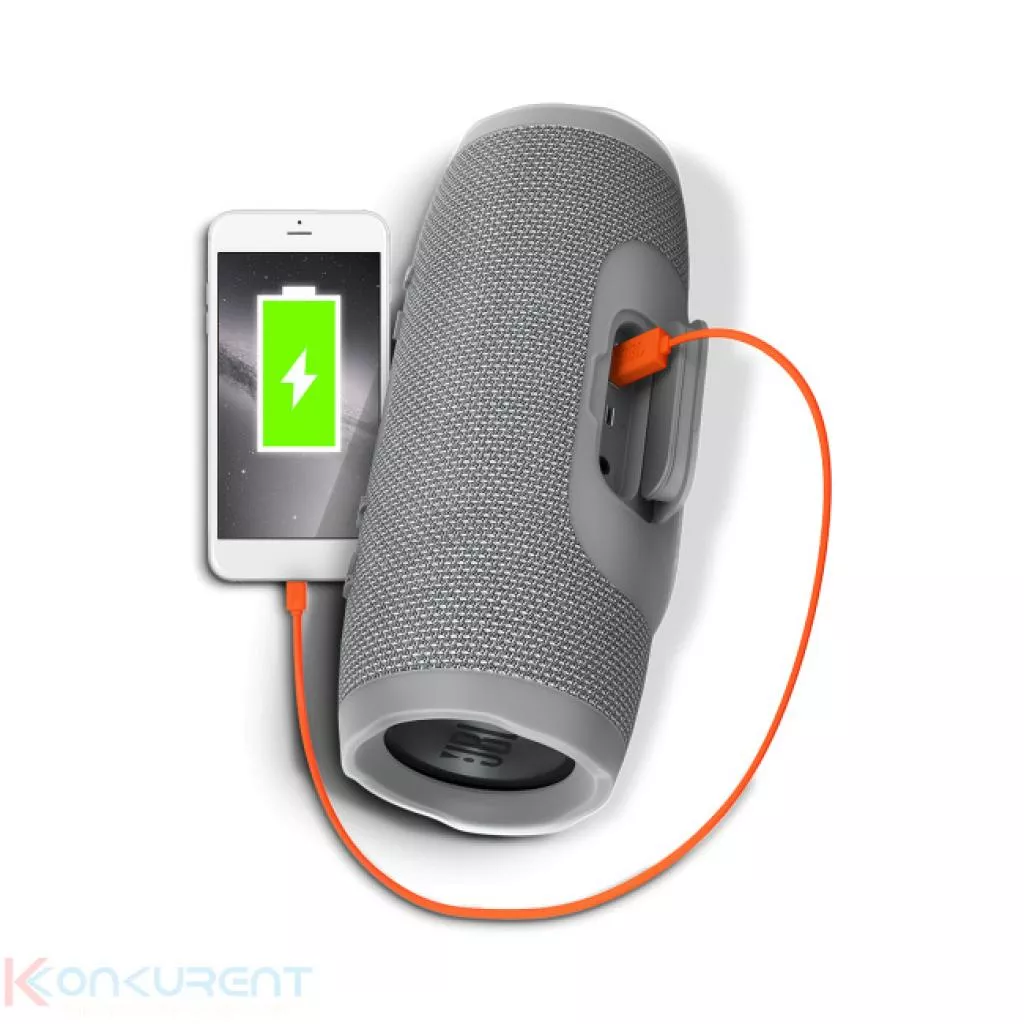 - уникальная беспроводная портативная акустическая система, которая гарантирует мощный стерео-звук и источник энергии в одном устройстве. Благодаря водонепроницаемому прорезиненному тканевому корпусу вечеринку с Charge 3 можно устроить в любом месте — у бассейна и даже под дождем.