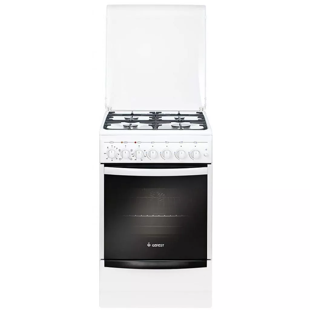 Плита для комфортного приготовления еды Gefest 5102-02 оснащена четырьмя газовыми конфорками и электрической духовкой. Все четыре конфорки покрыты прочными решетками под кастрюли. Мощность конфорок разная: есть конфорка с высокой мощностью, две со средней мощностью и одна с минимальной мощностью. Варочная поверхность накрывается крышкой, которая закрывает конфорки. Регуляторы мощности расположены на передней панели, что позволяет легко настраивать мощность, как на варочной поверхности, так и в духовке. Большая дверца духовки укомплектована удобной объемной ручкой белого цвета. Внизу есть ящик для аксессуаров, выдвигающийся из корпуса.