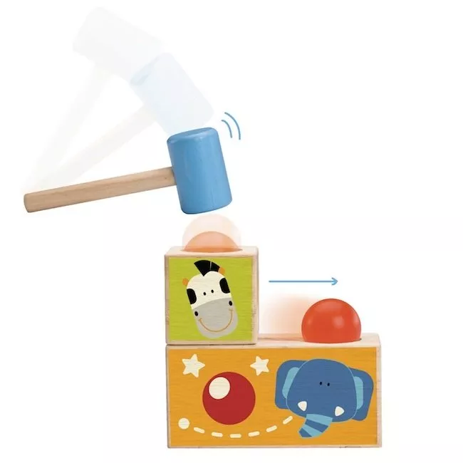 Общеизвестно, что сортеры развивают координацию движений, моторику рук, восприятие цветов и усидчивость. Набор "Шарики для забивания сафари" развивает также логическое мышление, планирование, мышцы рук и силу удара. И мальчики, и девочки получат удовольствие и от самого процесса игры, и от поражающих тактильных ощущений. Ударьте мяч в верхнем отверстии молотком и снова ударьте по мячу уже во втором, попробуйте угадать, куда он полетит? Играйте и развивайтесь с