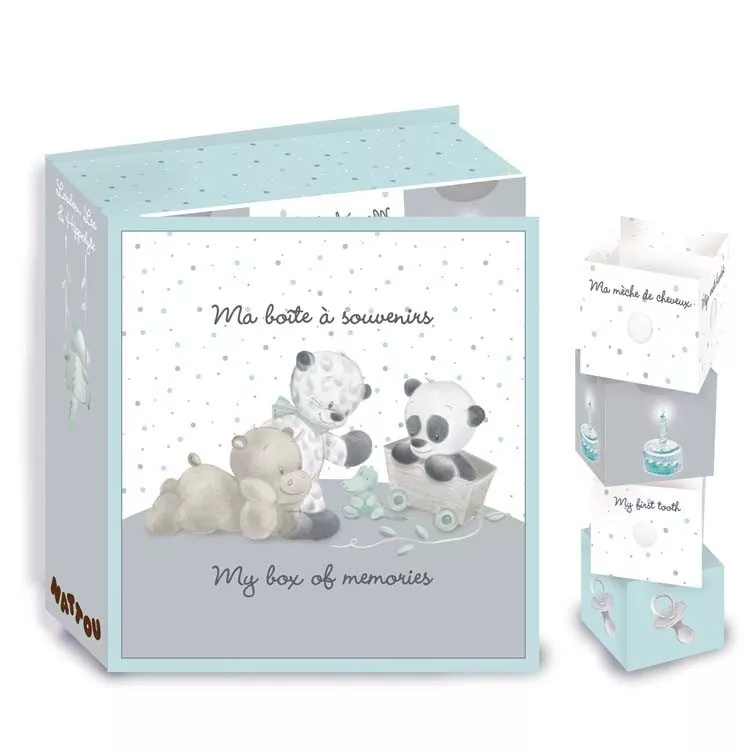 Копилка для сохранения первых и таких драгоценных вещей малыша. Набор серии «Лулу, Лея и Ипполит» создан бельгийским производителем Nattou специально для молодых родителей, которые хотят сохранить памятные моменты из жизни их ребенка. Коробочка произведена из плотного картона в приятных голубых цветах. Ее размеры: 25х26х9 см. Идеальный подарок молодой семье.