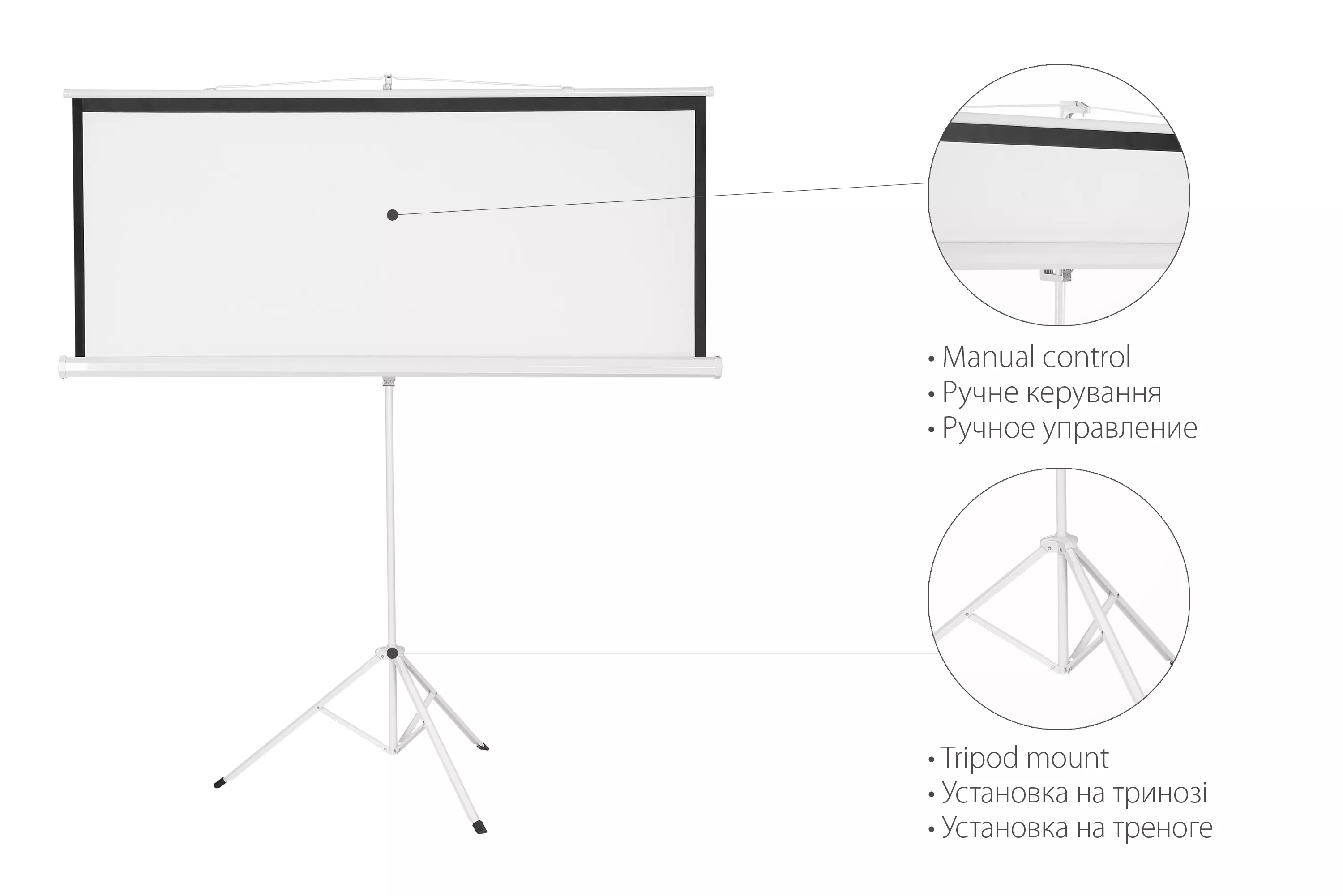 Тип - переносной на треноге, способ крепления - на стойке, тип проекции - прямая, тип конструкции - подпружиненный, ширина экрана - 145 см, высота экрана - 110 см, формат - 4:3, Matte White