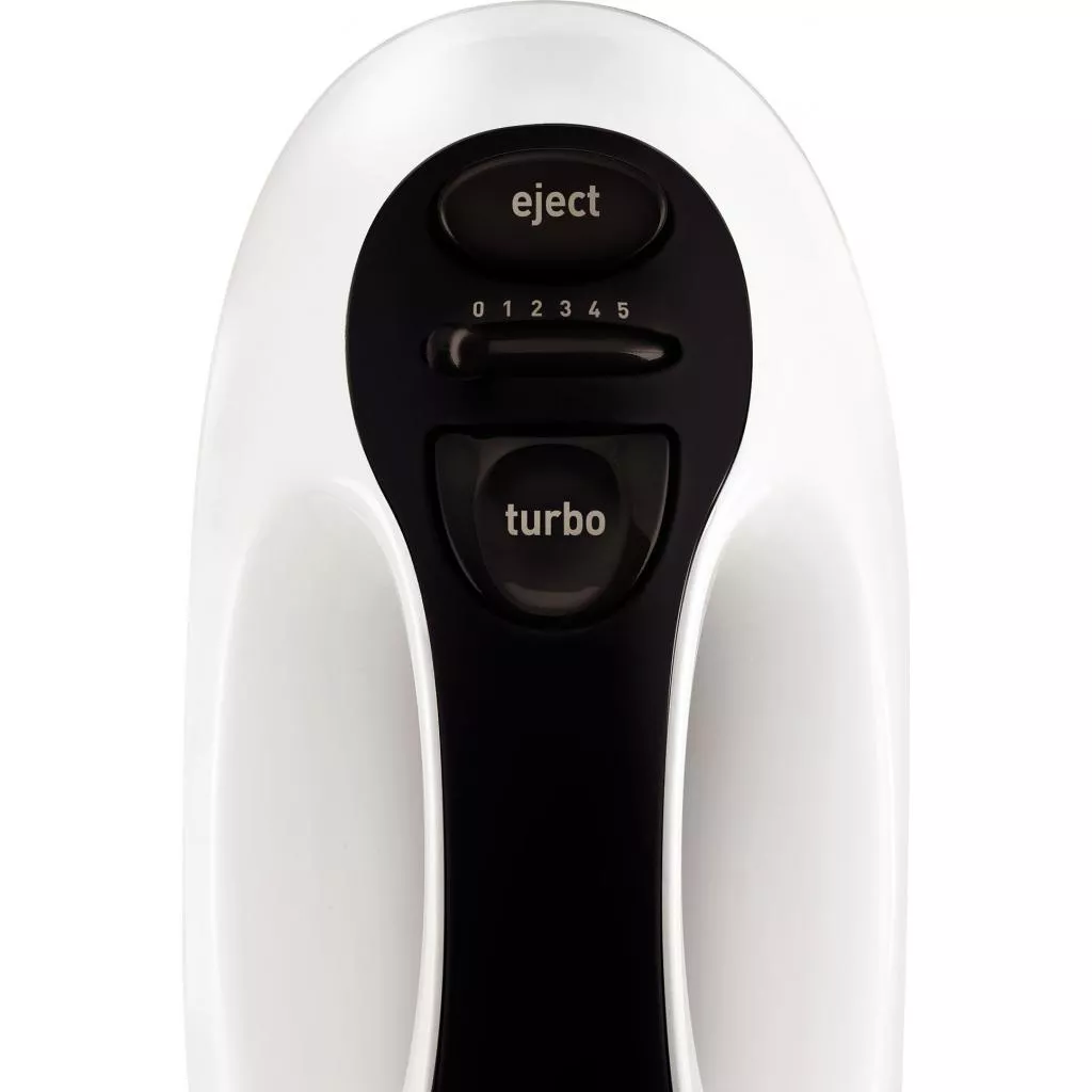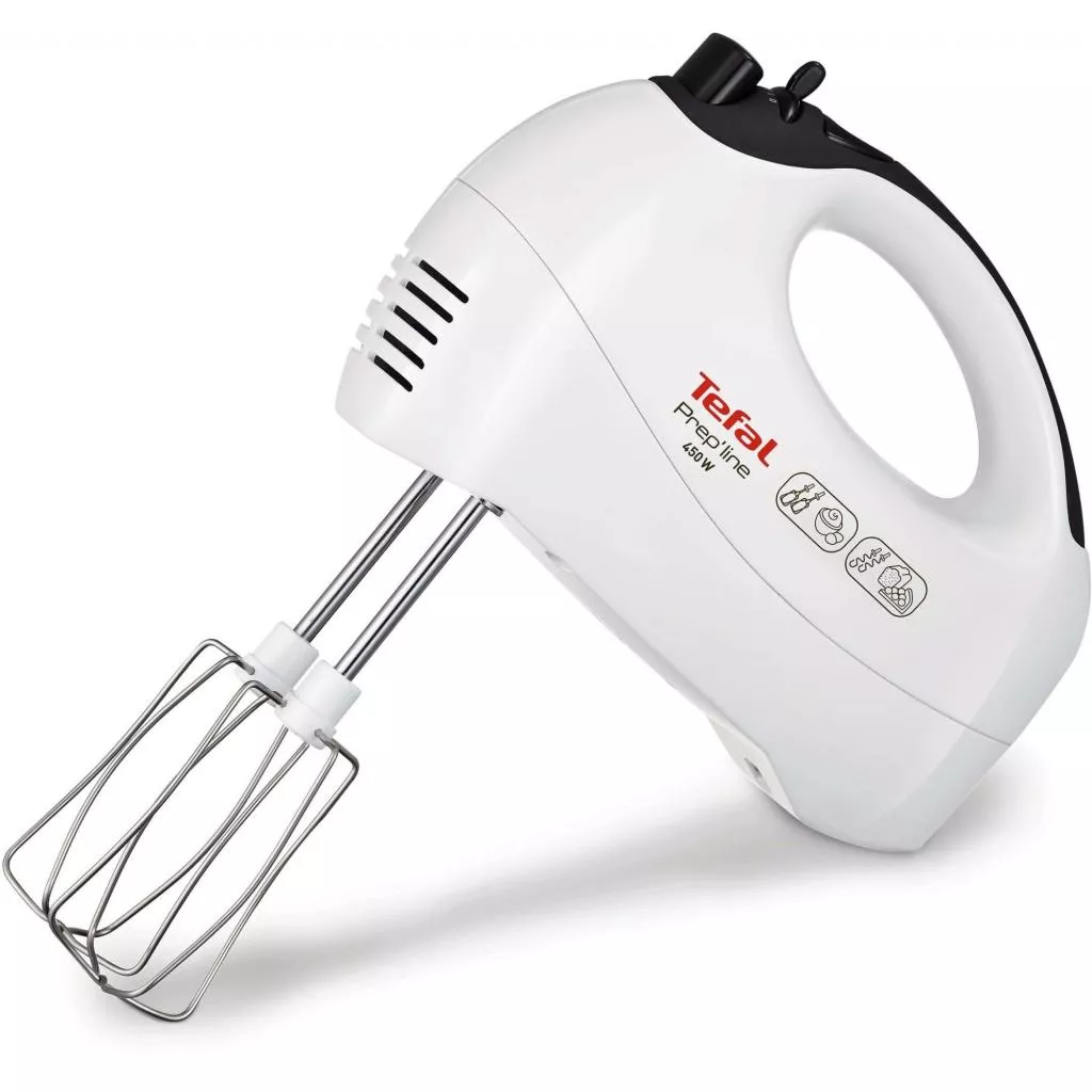 Работа. Ручной прибор Tefal HT411138 позволяет выбрать одну из пяти скоростей. Турборежим поможет за максимально короткое время подготовить тесто для выпечки или жарки. Эргономичная ручка позволяет с комфортом использовать агрегат. Кнопочная панель управления находится сверху рукоятки, то есть, управлять миксером можно одной рукой. Кнопка отсоединения насадок поможет быстро поменять насадки. На клавишах и ползунковом переключателе скоростей есть обозначения действия. Поэтому управлять миксером сможет каждый.