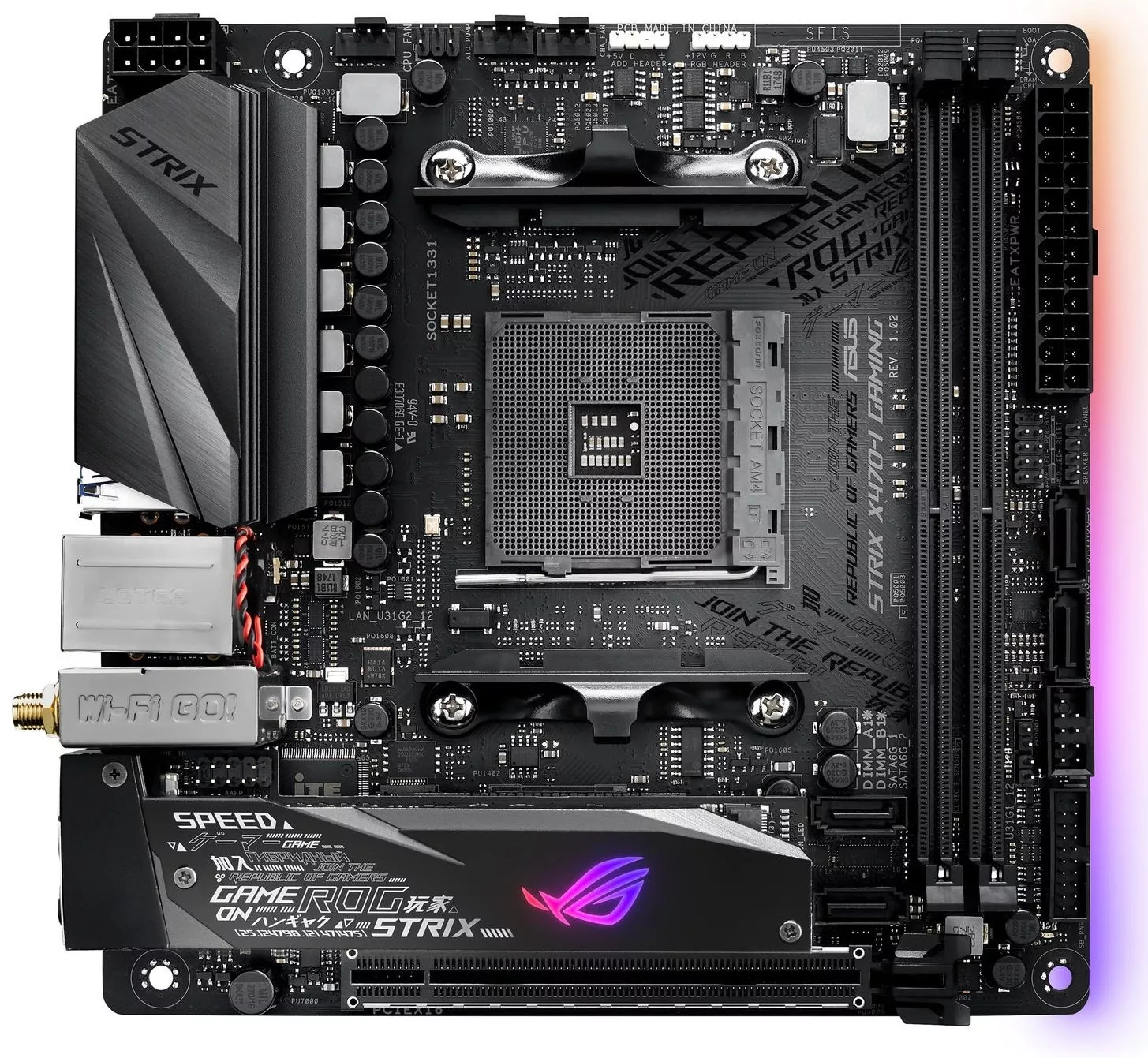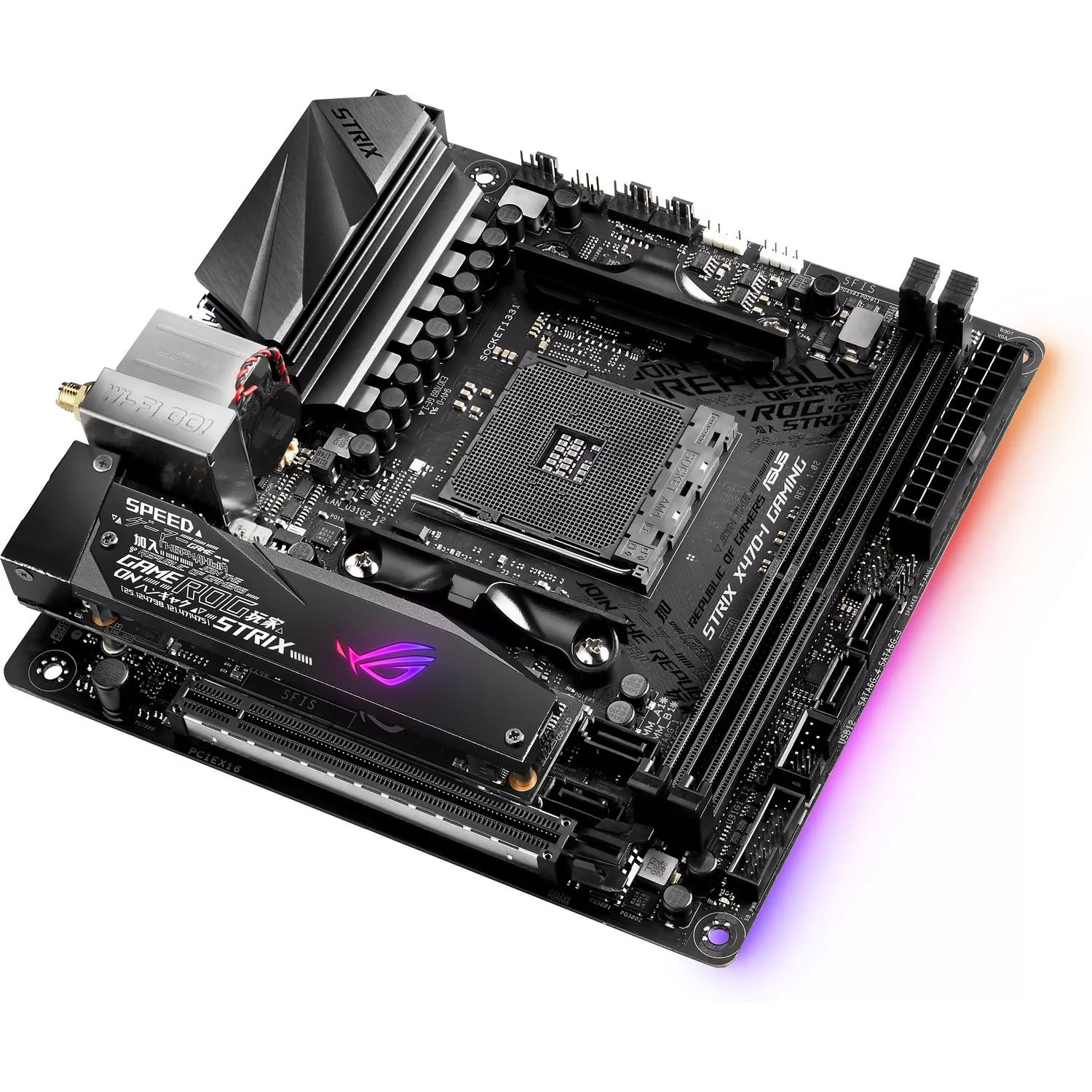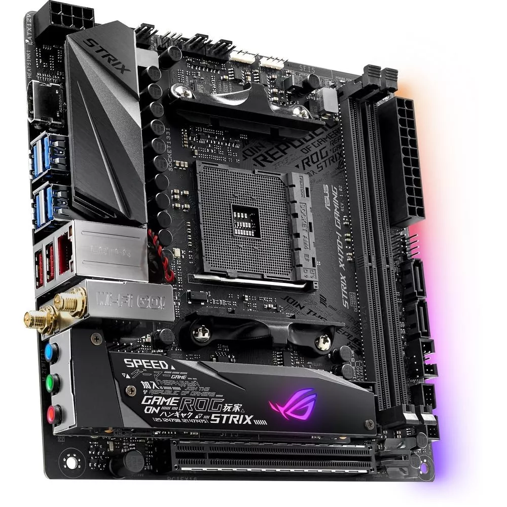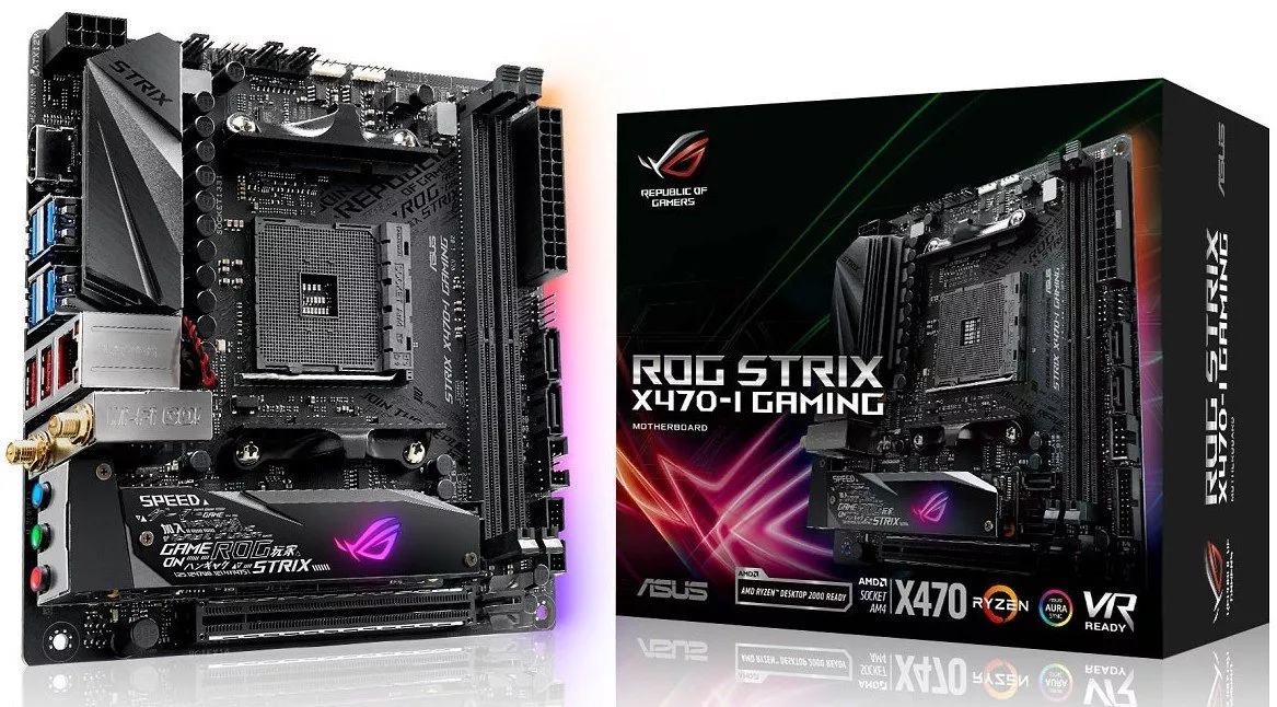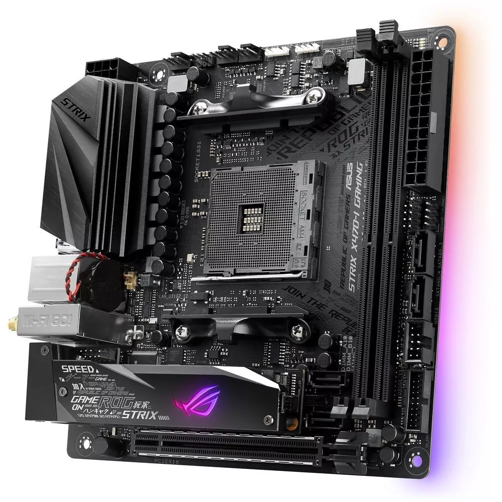 - Материнская плата формата Mini-ITX с чипсетом AMD X470, радиатором для слота M.2, синхронизируемой подсветкой Aura и современными интерфейсами