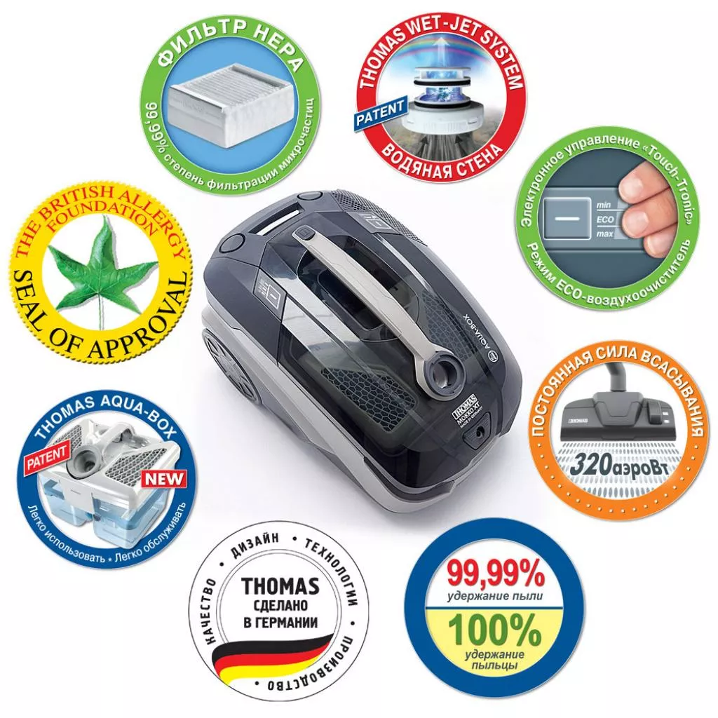 Качественный современный пылесос THOMAS MOKKO XT (788592) обладает большим функционалом и отличными техническими характеристиками, за счет чего и завоевал большую популярность среди потребителей. Thomas MOKKO Aqua Box XT, кроме уборки помещений, имеет еще и возможность осуществлять водяную очистку воздуха, устраняя из него опасные для человека частички пыли и аллергены, при этом увлажняя его.