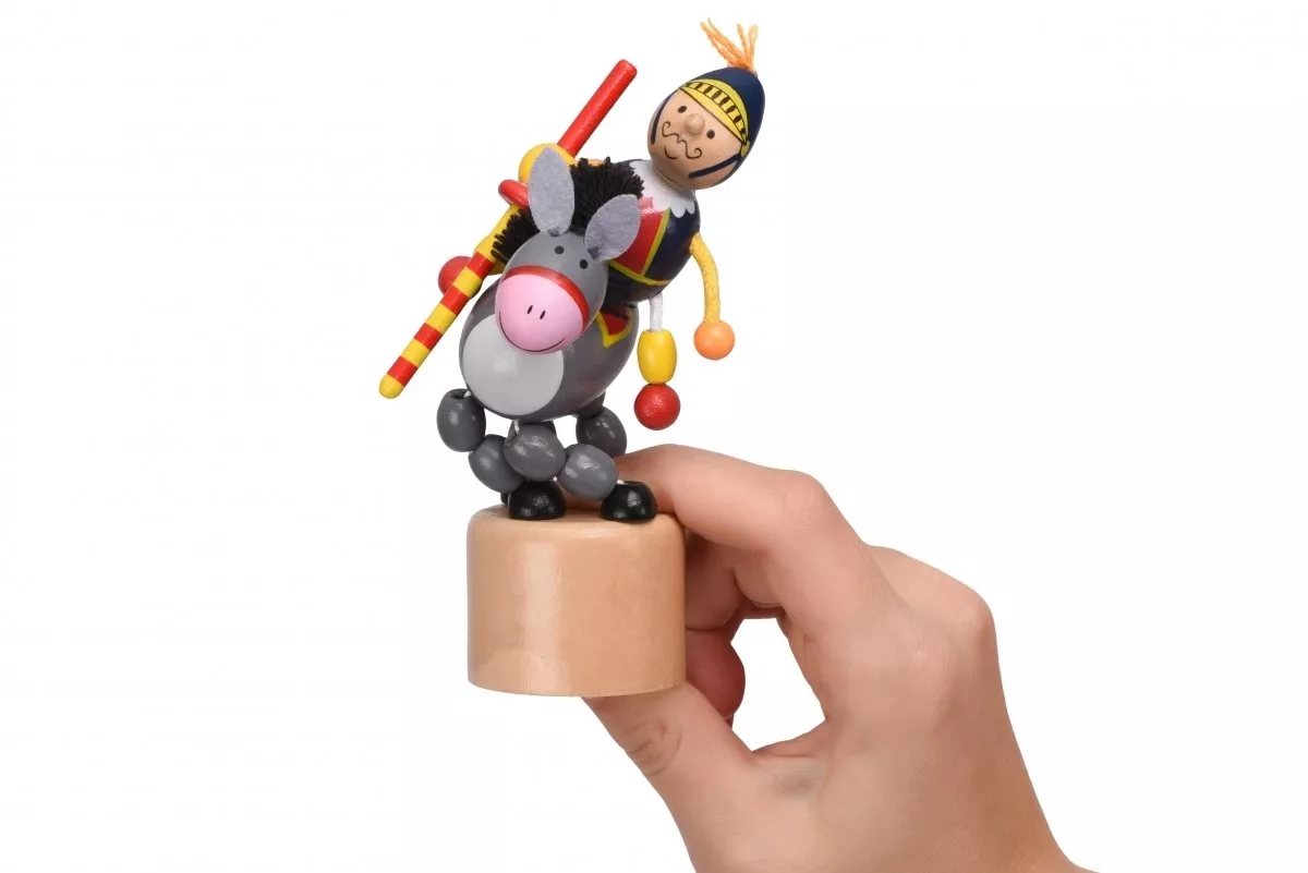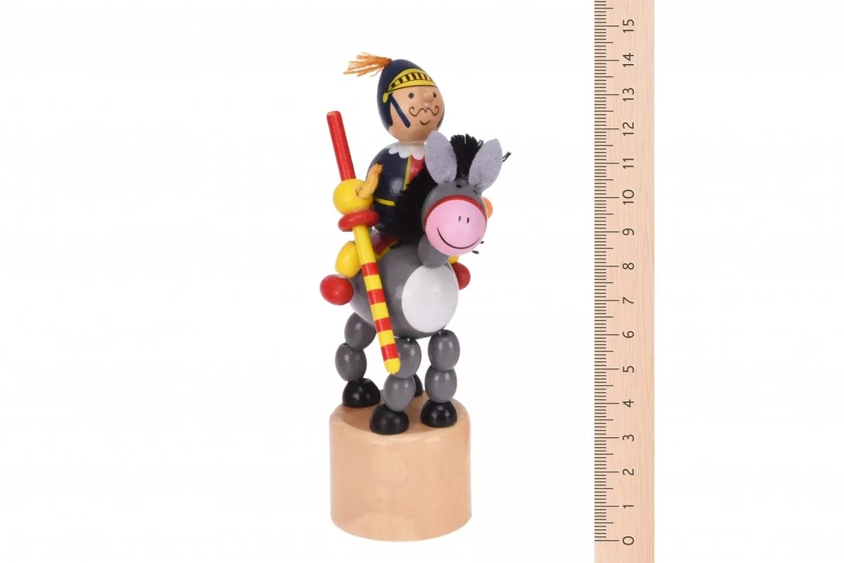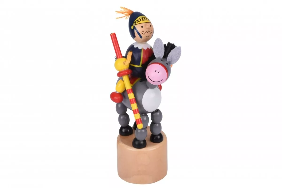 Деревянная фигурка рыцаря на ослике - интерактивная игрушка немецкого бренда Goki. Изделие подвижное, благодаря особой конструкции в виде нанизанных на нить деталей, стоит только нажать на кнопку под основанием и потрясти изделие. Танцующая игрушка произведена из натурального дерева, покрыта безопасными цветными красками на водной основе. Эта игрушка будет способствовать развитию мелкой моторики, координации движений, слуха, зрения, чувство ритма. Игрушки можно использовать в сюжетно-ролевых играх.