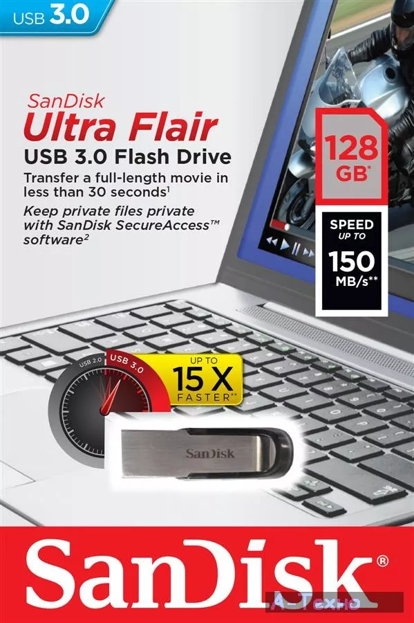 USB флеш накопитель SANDISK 128GB Flair USB 3.0 (SDCZ73-128G-G46) гарантирует быструю передачу файлов. Экономьте время — отдайте предпочтение высокой скорости USB 3.0, которая достигает 150 МБ/с. Такая скорость позволяет передавать целые фильмы, аудиокниги и музыкальные библиотеки всего за несколько секунд.