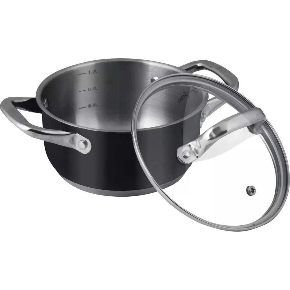 На внутрненнюю часть нанесена литровая градуировка. Элегантные ручки из нержавеющей стали для повышенной защиты, функциональности и комфорта. Кастрюля имеет массивное многослойное основание для быстрого приготовление без вреда для здоровья на основе аккумулирования тепла и теплообмена. Подходит для мытья в посудомоечной машине