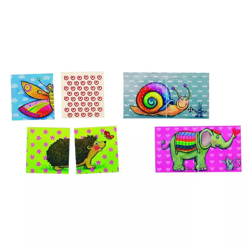 Игра мемо goki обязательно понравится малышам. Половина животного на карточке отсутствует. Есть 16 животных и две половинки, которые образуют пару. Каждый игрок пытается сопоставить как можно больше пар.