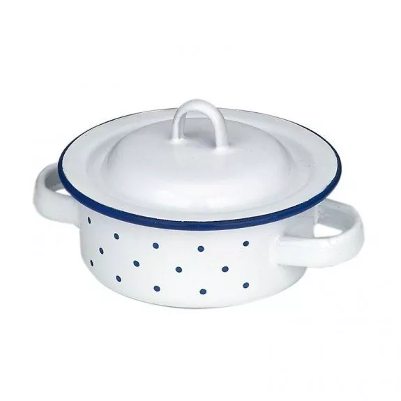 Игрушечная кастрюлька немецкого производителя игрушек станет незаменимым элементом детской кухни. Изготовлена ??из металла, имеет эмалированное покрытие. Белоснежная кастрюлька с узором в синюю точечку. Кастрюлька с двумя ручками.