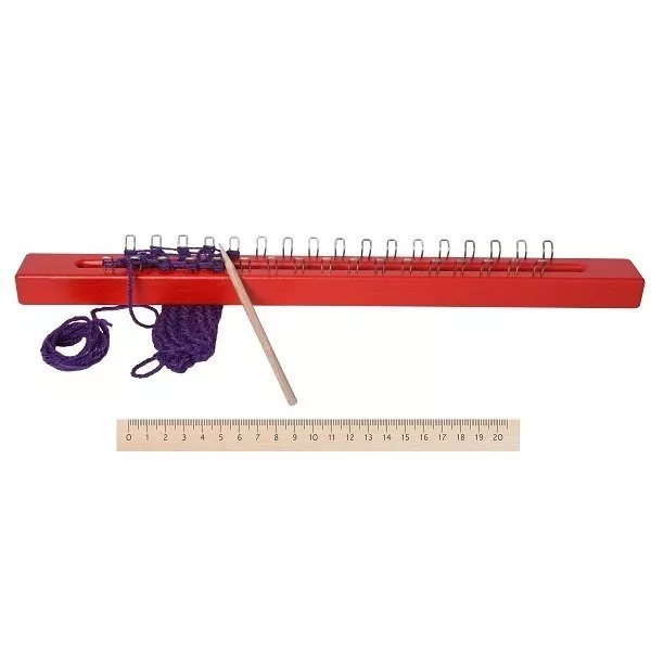 Все девочки хотят научиться вязанию и легко плести разнообразные вещи, как её мама или бабушка. Станок немецкого производителя игрушек Nic для кругового вязания шарфов, шапок, носков и тому подобное изготовлен из натурального дерева, покрытого красной краской на водной основе. Он выполнен в виде рамки с петлями по периметру. С его помощью можно связать пышные ажурные или плотные шарфы, носки, в зависимости от толщины нити.