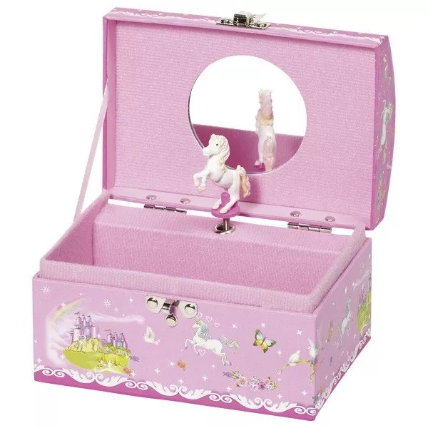 Волшебная музыкальная шкатулка для девушек. Ящик немецкого производителя игрушек goki имеет прямоугольную форму, сделана из натуральной древесины, покрытой розовыми красками на водной основе. Внешне ящик украшена рисунками. Открыв ящик, девочка найдет в ней зеркальце, место для своих украшений и фигурку лошадки, вращающейся под классическую мелодию. Закрывается ящик на маленький серебристый замочек. Размер: 16 x 10.7 x 10.3 см