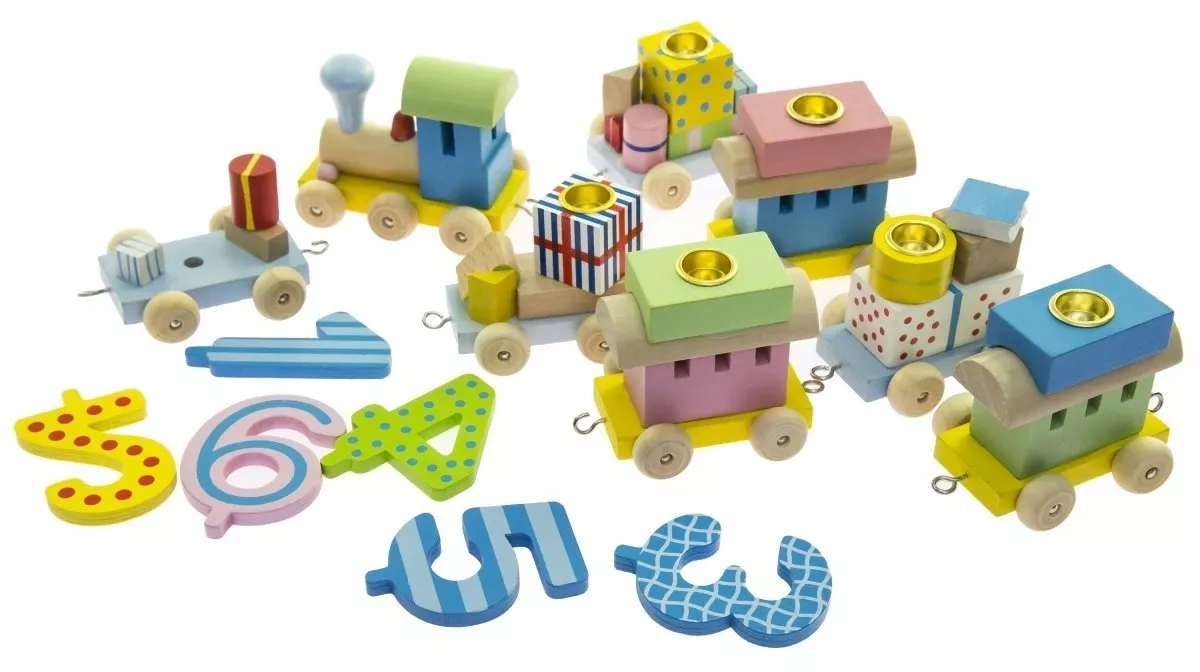 Яркий аксессуар-подставка для свечей «Подарочный экспресс» немецкого производителя игрушек goki в виде паровозика из натурального дерева. Подставка покрыта экологическими красками на водной основе. Экспресс состоит из 8 вагончиков: первый (главного) и шести промежуточных с подсвечниками. В конце поезда - еще один вагон с отверстием для цифры, соответствующей возрасту именинника. Всего в наборе шесть цифр 1-6. Длина «подарочного экспресса» составляет 52 см.