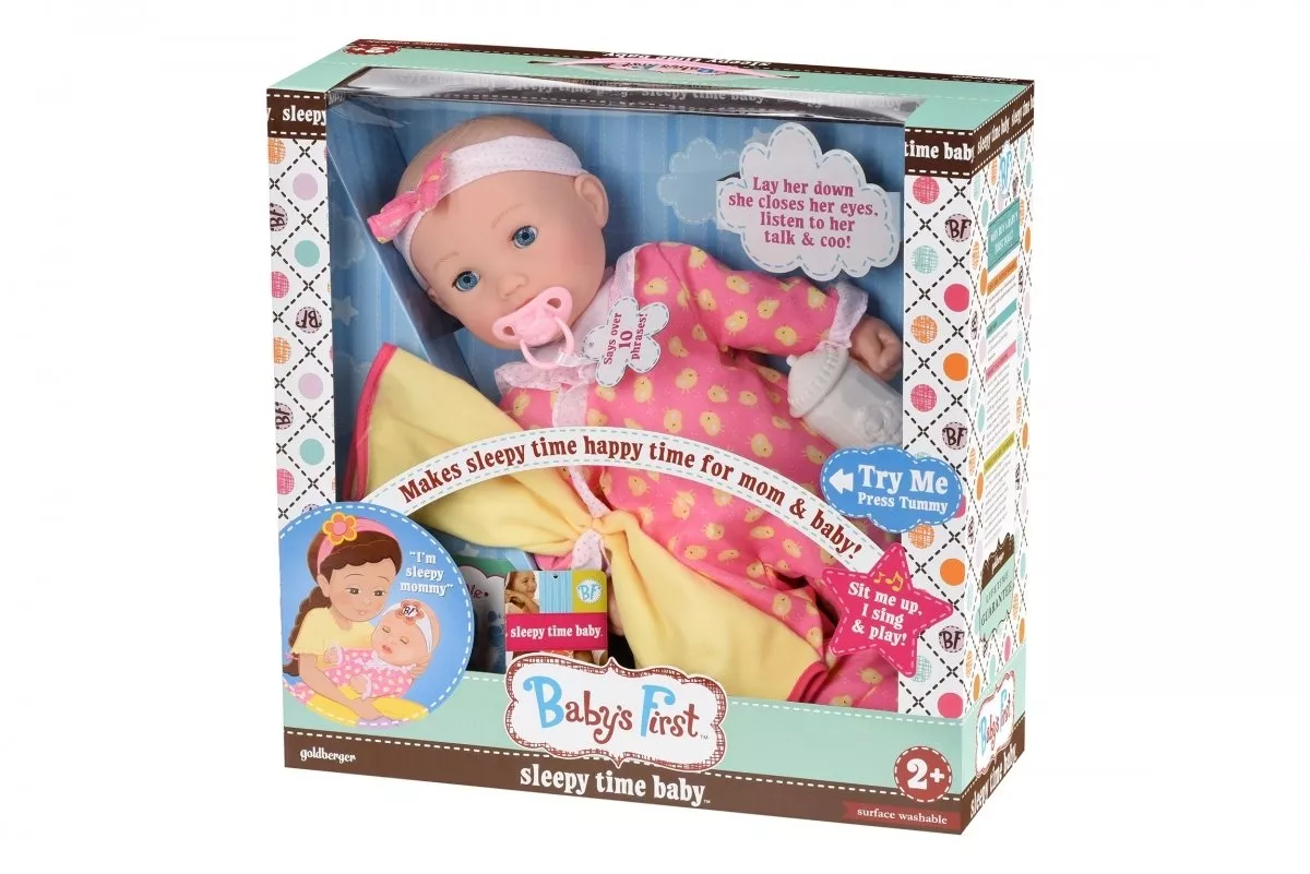 Пупс Baby's First Sleepy Time Baby - лучшая игрушка во время сна ребенка, будет укачивать малыша. Куклу приятно обнимать и укладывать спать. Если ее посадить и нажать на животик, она будет смеяться, хлопать в ладоши и призвать к игре. А если ее положить спать - она споет колыбельную. Все фразы пупс говорит на украинском и английском языках. Куклы Baby's First помогают в развитии, учат правильным манерам, заботе о других, прививают навыки игры, обучение, правильного сна.