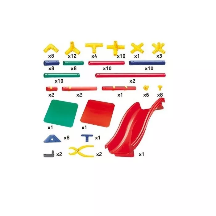 Из 121 элемента, который входит в набор, можно построить горку и другую мебель. Всего доступно 10 моделей для построения. В набор входит красочная инструкция.
