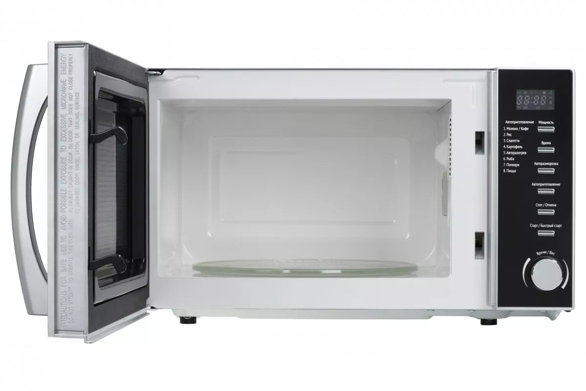 Гриль не предусмотрен. Для открытия дверцы есть ручка, а для управления – шесть клавиш и поворотный переключатель. Клавиши отвечают за различные режимы, а переключатель – за регулировку веса и времени приготовления.