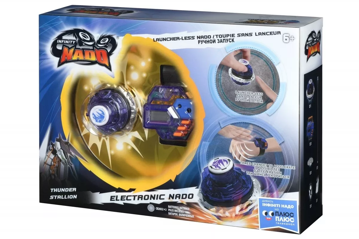 Новый супер-набор с волчком серии «Электроник» турнирных бойцов Infinity Nado. Волчок Thunder Stallion балансирующего типа выполнен в инновационном дизайне, с ручным запуском и с контроллером ускорения волчка, который имеет вид фантастических часов. Контроллер дает 3 попытки использовать 100 единиц мощности за одну игру.