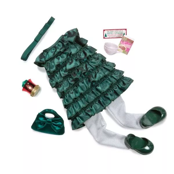 Комплектация: 22 предмета (кукла, платье, пара колготок, 2 повязки, кошелек, пара обуви, жилет, гетры, пара носков, пара ботинок, свеча, чашка, бумажный купон, пакет горячего шоколада, закладка, книга).