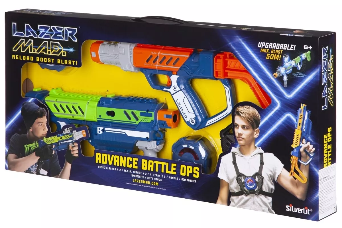 С помощью Silverlit Lazer M.A.D. "Делюкс набор" игроки смогут перейти на новый уровень ведения боя! Комплект состоит из 2 бластеров и аксессуаров, оснащенных звуковым переключателем, триггером со специальным эффектом, световыми эффектами, громкоговорителем и селектором команд A/B. Главное преимущество набора - модуль 15 м, благодаря которому можно увеличить дальность стрельбы до 50 м. Игру можно вести и в ночное время.