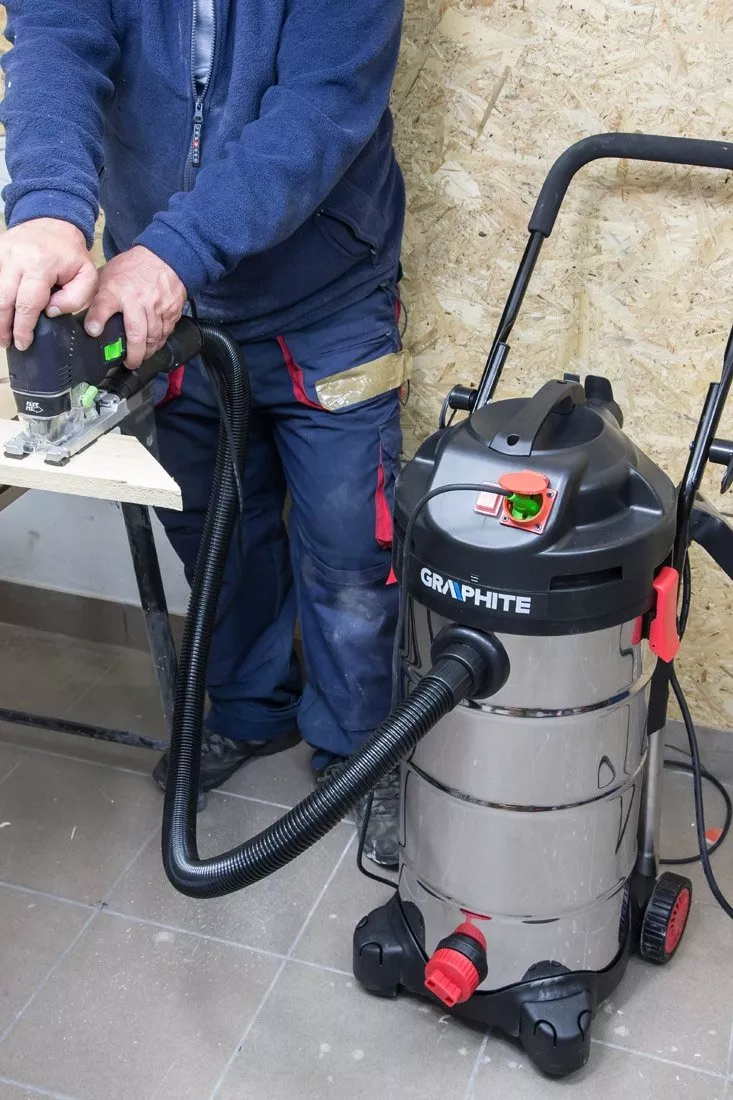 Профессиональный промышленный пылесос GRAPHITE с двигателем мощностью 1500 Вт, предназначен для быстрой и эффективной уборки мусора после выполнения работ в мастерской. Пылесос с вместительным 40-литровым баком из нержавеющей стали, служит как для влажной, так и для сухой уборки. Благодаря большой силе всасывания, равной 18 кПа, и диаметра насадки шланга - 35 мм, пылесос может использоваться для уборки различного мусора. Пылесос с функцией воздуходувки. Кроме того, пылесос оснащен поплавковым клапаном безопасности для влажной уборки и сливной пробкой для слива грязной воды. Большие задние колеса и предотвращения кронштейнами передние колеса обеспечивают безопасное перемещение в тяжелых рабочих условиях. Существует возможность подключения электроинструмента с максимальной мощностью 2000 Вт к розетке пылесоса. Трехпозиционная кнопка включения обеспечивает пуск пылесоса при включении электроинструмента, или пуск только пылесоса без электроинструмента. Пылесос оснащен металлической трубкой с возможностью регулирования ее длины. В основе пылесоса предусмотрено место для хранения сменных насадок. В набор входят: шланг, сменные насадки, телескопическая трубка, пылесборник, поролоновый фильтр, фильтр, фиксаторы шнура питания и переходник.