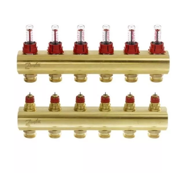 Назначение Для отопления, Для теплого пола. Тип Распределительный. Материал коллектора латунь. Диаметр подключения коллектора 1". Расходомер Есть. Количество выходов 6. Маx. рабочая температура, °С 95. Макс. рабочее давление, бар 10. Тип соединения клапана Danfoss RA. Диаметр выходов 3.4 (дюйм). Резьба коллектора Внутренняя