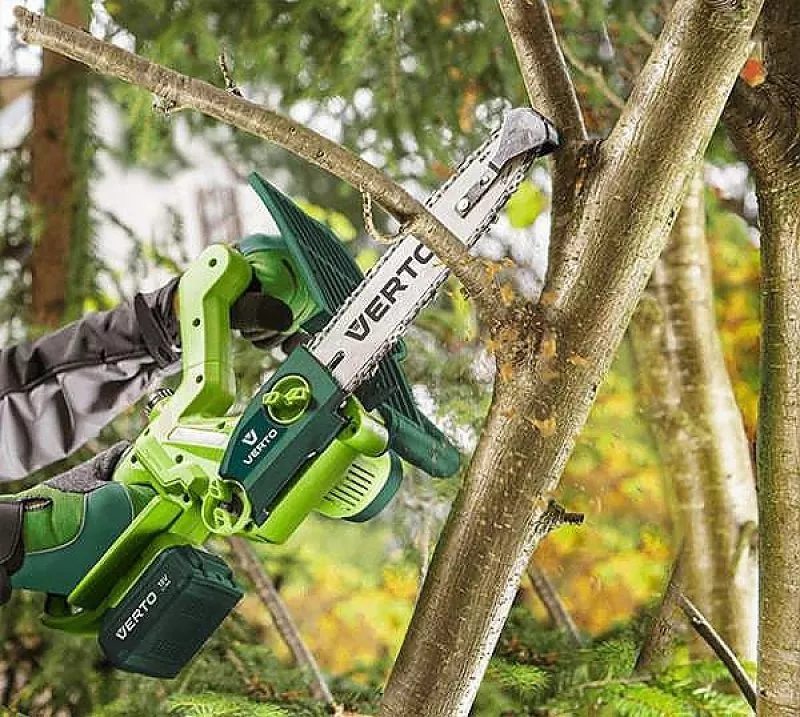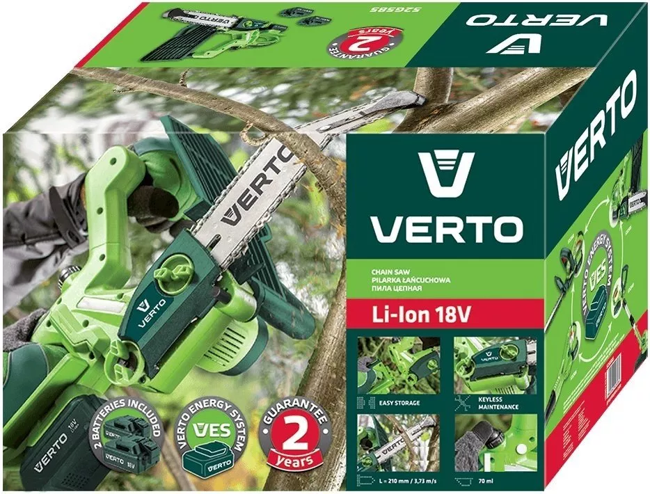 Пила цепная аккумуляторная Verto с направляющий шиной 12" пригодится при выполнении большого объема работ как на приусадебном участке, так и в саду. Оснащена тормозом безопасности, который защищает пользователя в случае обратного удара во время работы, а также защитой от случайного включения. Пила оснащена автоматической системой смазки цепи и индикатором уровня масла. Пилу не нужно подключать к сети, что значительно повышает комфорт работы. Соответствие европейским стандартам в области безопасности подтверждает сертификат CE.
