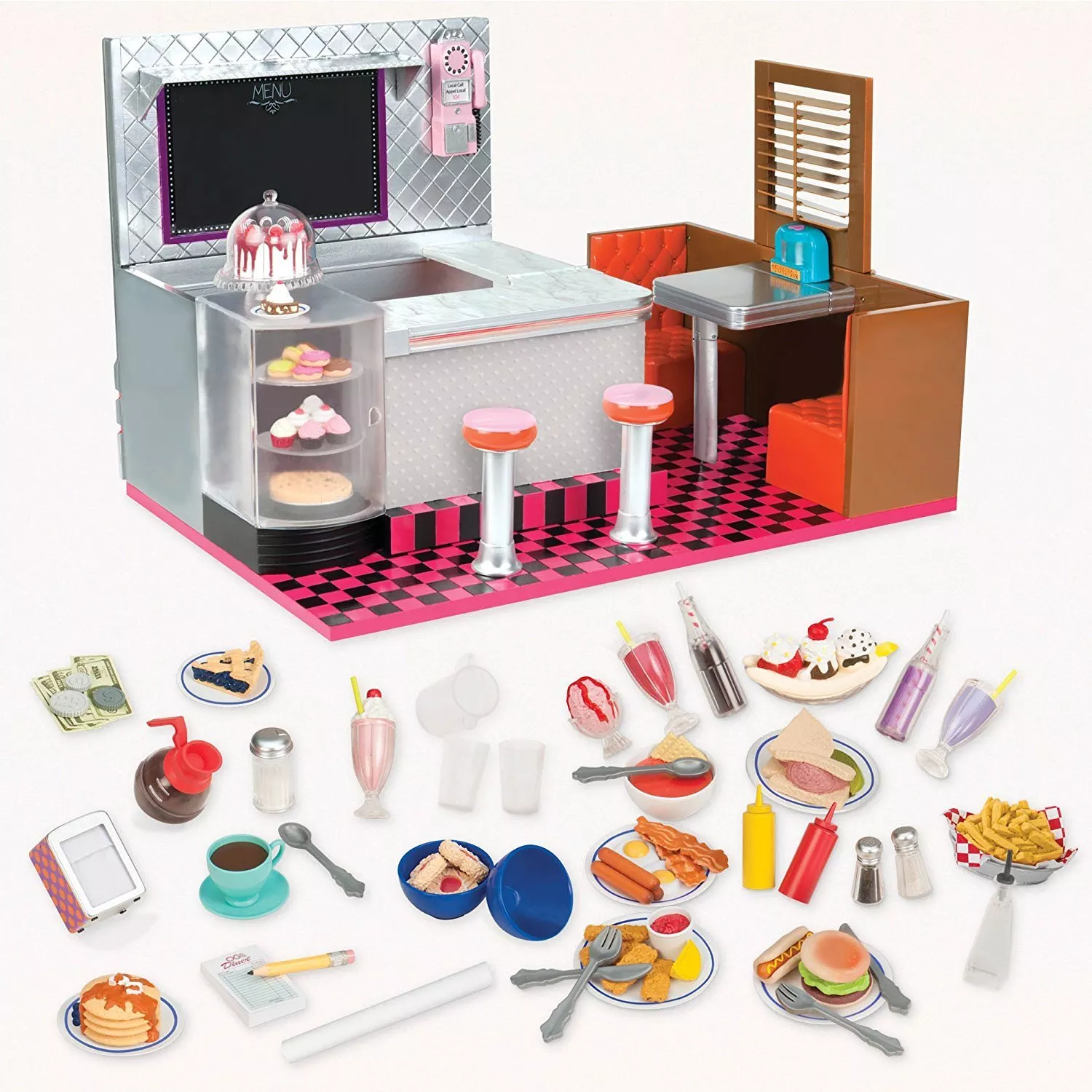 Ретро столовая станет интересным дополнением для игрушек Our Generation. Главная особенность набора- музыкальный автомат, который воспроизводит 6 песен и неоновый свет вокруг столовой; внутри есть настоящая доска и мел; жалюзи, раскладной столик; вращающийся дисплей для торта. Все элементы функциональны и реалистичны.