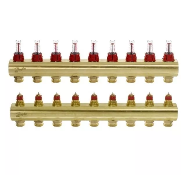 Назначение Для отопления, Для теплого пола. Тип Распределительный. Материал коллектора латунь. Диаметр подключения коллектора 1". Расходомер Есть. Количество выходов 10. Маx. рабочая температура, °С 95. Макс. рабочее давление, бар 10. Тип соединения клапана Danfoss RA. Диаметр выходов 3.4 (дюйм). Резьба коллектора Внутренняя