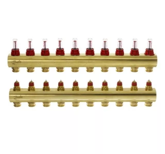 Назначение Для отопления, Для теплого пола. Тип Распределительный. Материал коллектора латунь. Диаметр подключения коллектора 1". Расходомер Есть. Количество выходов 11. Маx. рабочая температура, °С 95. Макс. рабочее давление, бар 10. Тип соединения клапана Danfoss RA. Диаметр выходов 3.4 (дюйм). Резьба коллектора Внутренняя