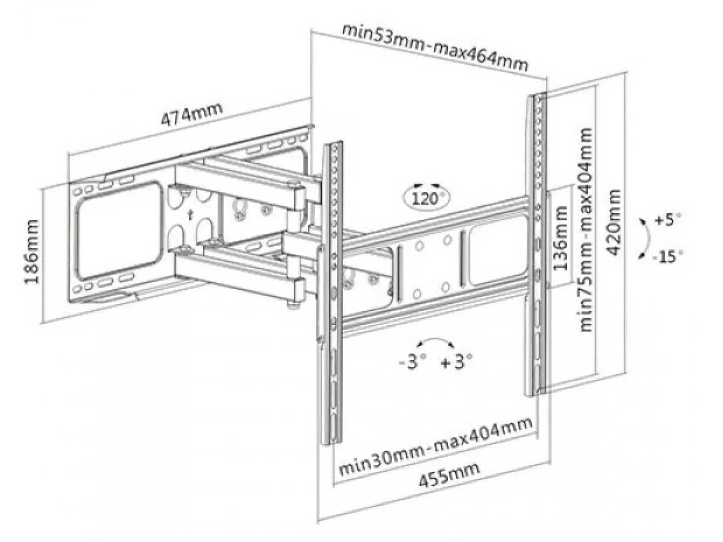Максимальная нагрузка 40 кг. Тип Наклонно-поворотные. Количество степеней свободы 3. Цвет Белый. Совместимость (диагональ) 32" - 55". Размеры 500 х 50 х 230 мм. Угол наклона +5°~-15°