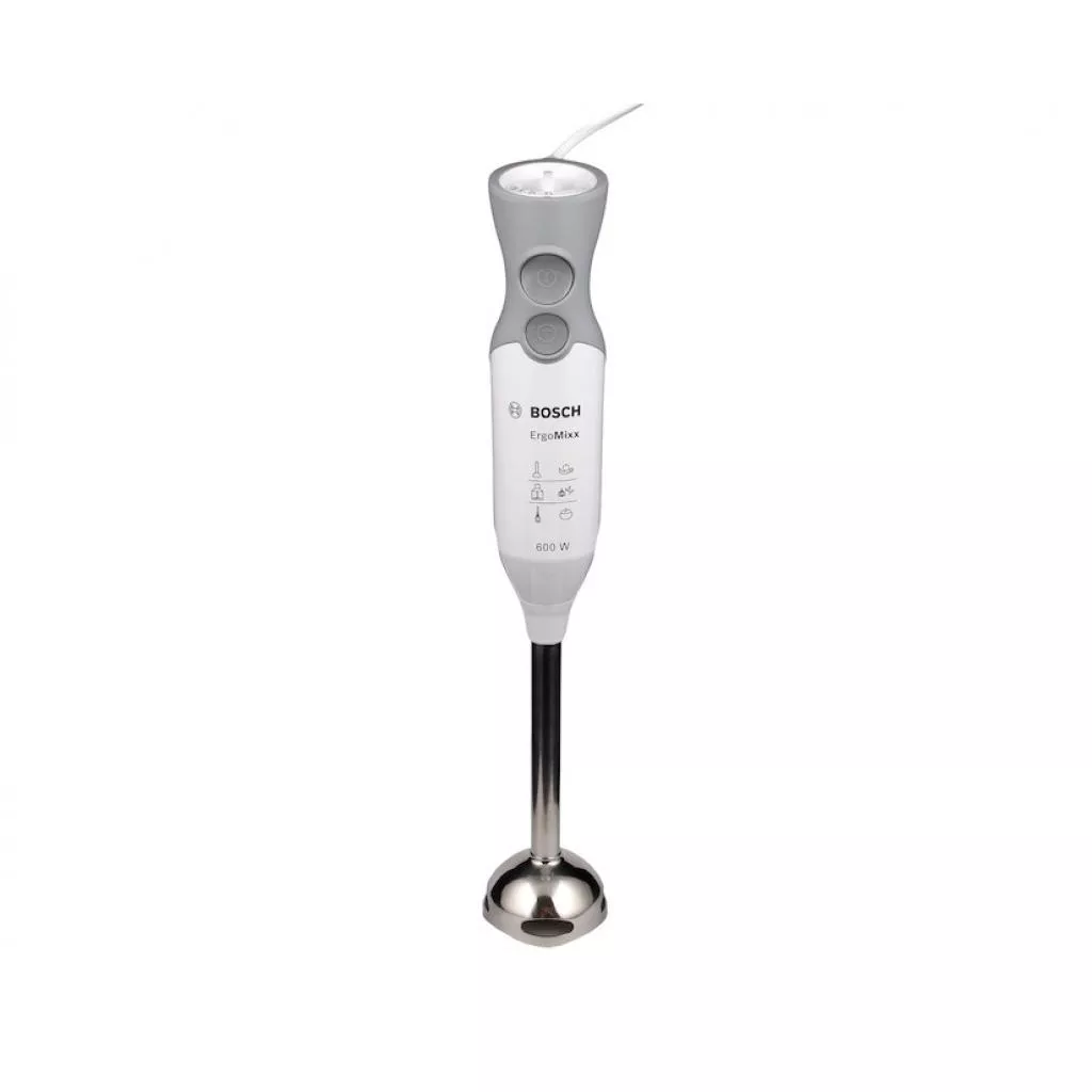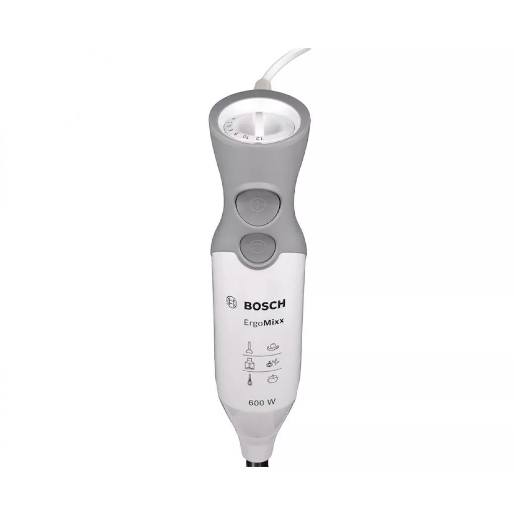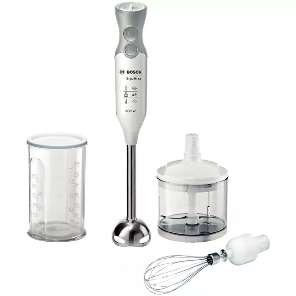 Блендер BOSCH MSM66150. Все ради комфорта: небольшой вес прибора, эргономичный дизайн ручки, противоскользящее покрытие SoftTouch. В комплект входит ряд аксессуаров, таких как универсальный измельчитель и венчик для взбивания яиц и сливок. Мощный двигатель (600 Вт) для еще большей производительности. Ножка блендера из нержавеющей стали с крестообразным ножом QuattroBlade для выполнения широкого спектра задач. 12 уровней мощности и турборежим для достижения максимальной мощности простым нажатием на кнопку делают этот блендер действительно универсальным прибором.