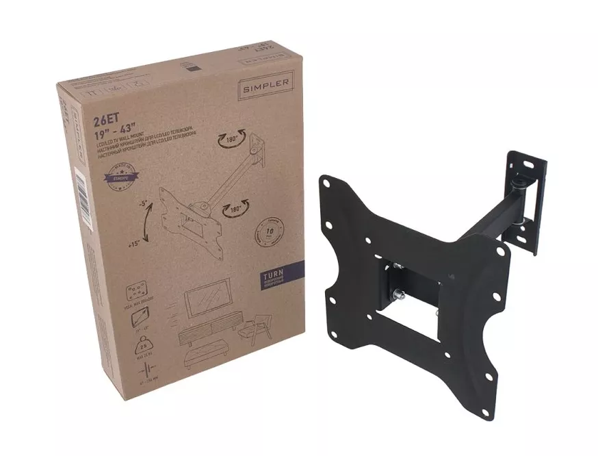 Тип крепления кронштейн, Вид кронштейна наклонный, поворотный, Модель 26ЕТ, Максимальная диагональ телевизора 43, Максимальная нагрузка, кг 20, Штрихкод 4820205750298