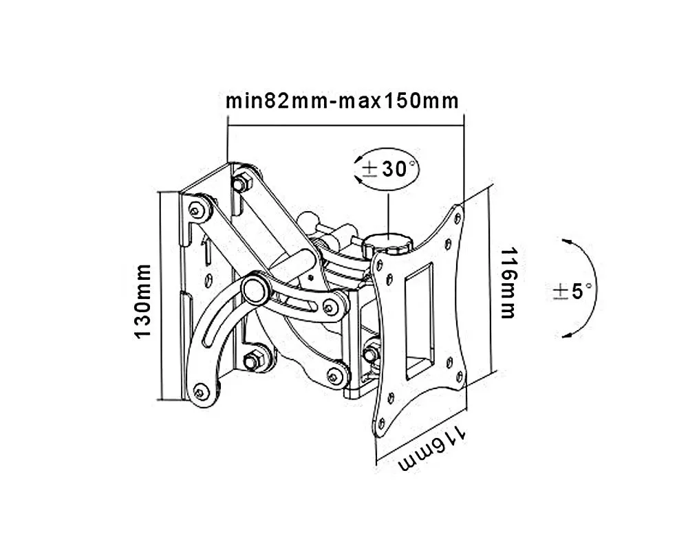 Наклонно-поворотный кронштейн для настенной установки монитора или LCD-телевизора с диагональю 13-27” и весом до 30 кг. Расположение крепежных отверстий – VESA 75 x 75 и VESA 100 x 100