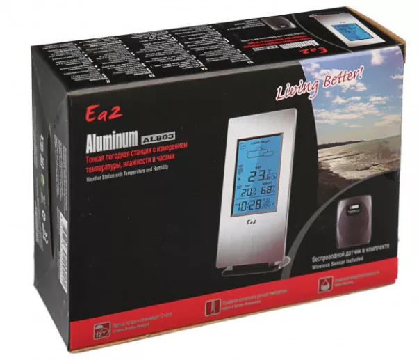 Метеостанция Ea2 AL803 Aluminium Slim - недорогая погодная станция для дома и офиса. Цифровая беспроводная метеостанция отличается достаточно широким функционалом: построение прогноза погоды, измерение температуры и влажности, а также атмосферного давления. Метеостанция Ea2 AL803 Aluminium Slim может стать отличным подарком для семейного пользования