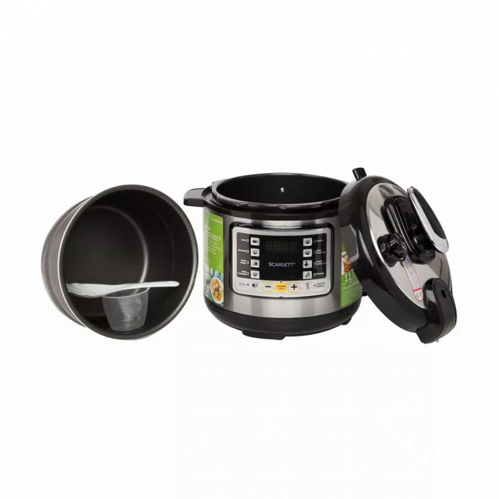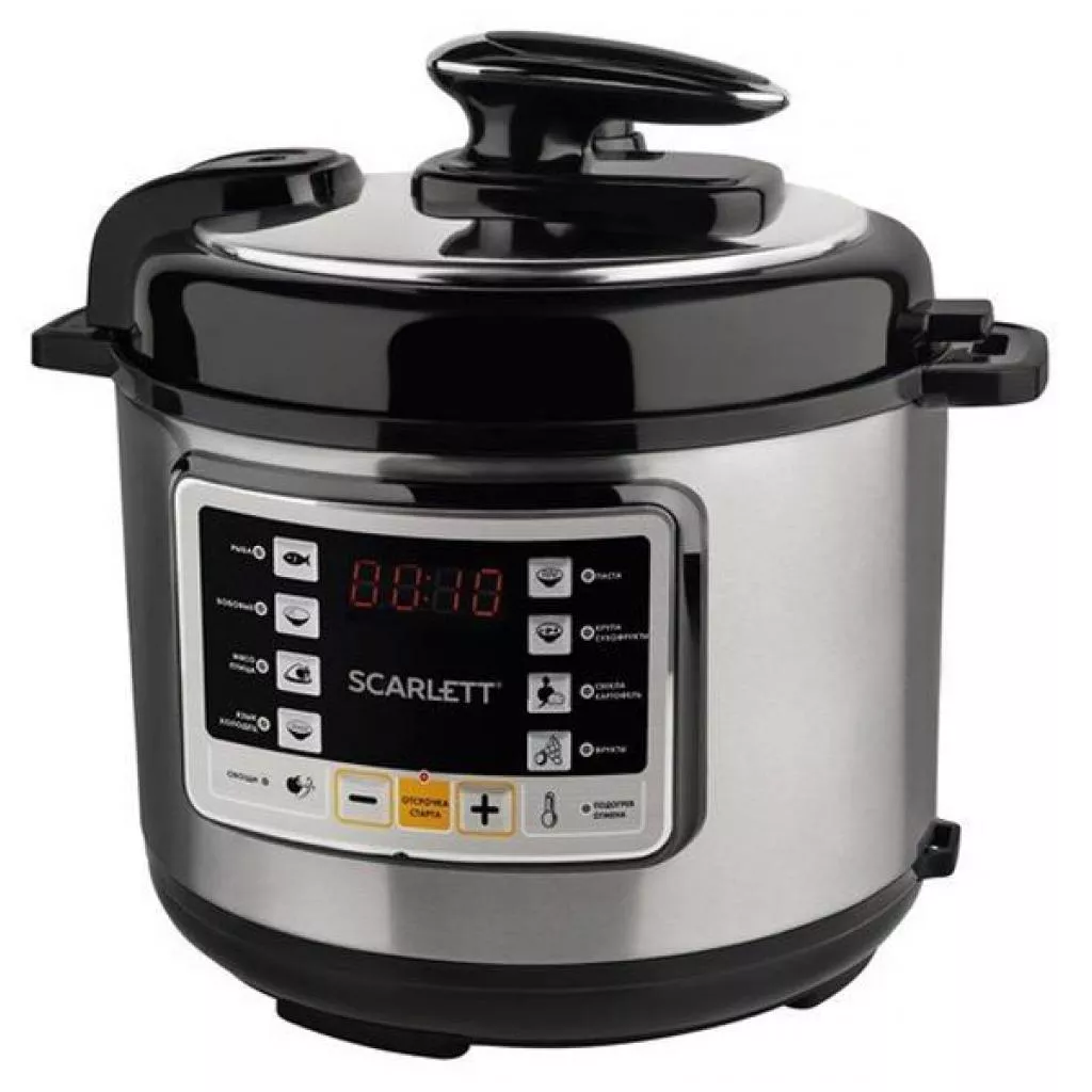 Мультиварка-скороварка SC-MC410P02 от SCARLETT мощностью 900 Вт с возможностью приготовления под давлением оснащается чашей с 2-х слойным антипригарным покрытием емкостью 5 литров.