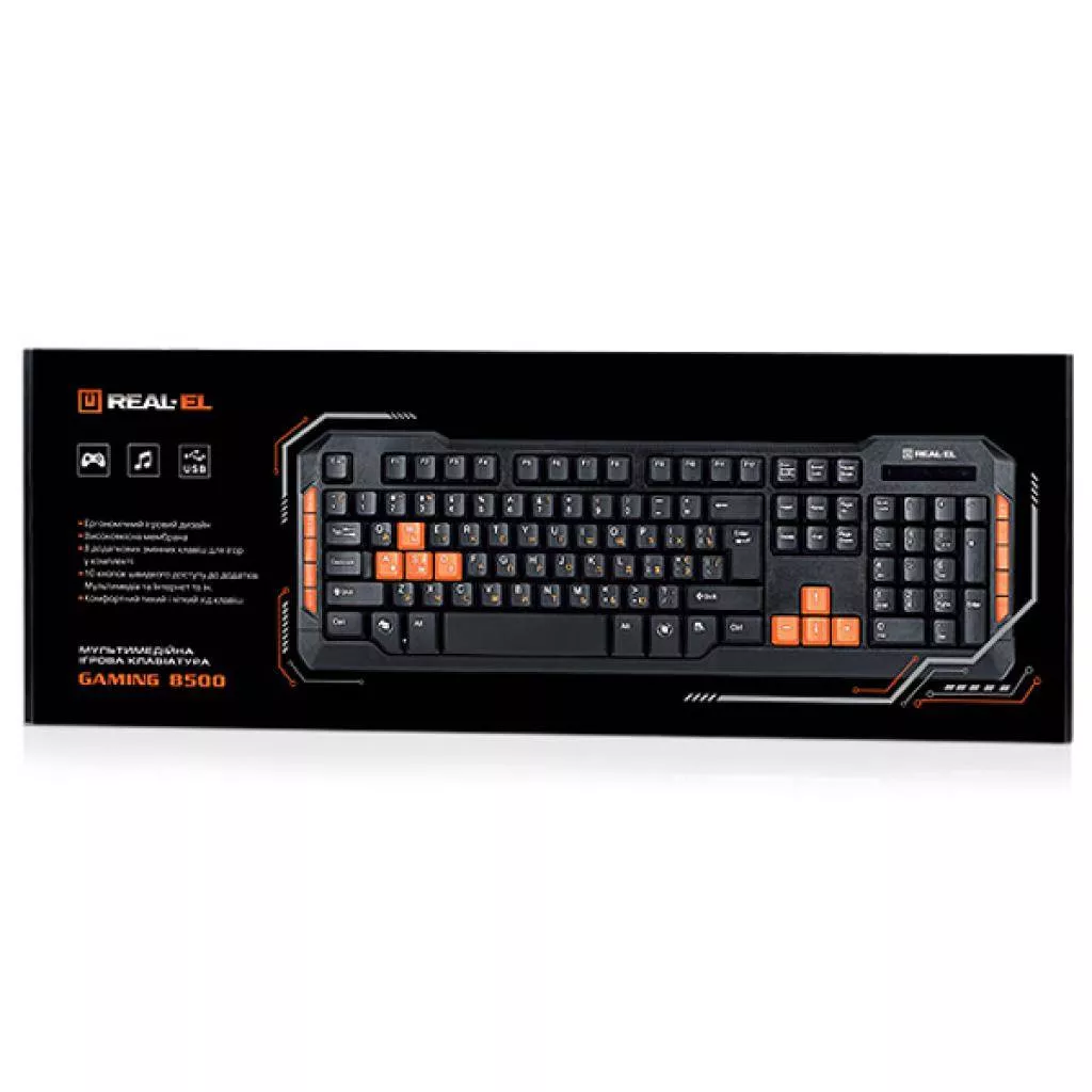 Клавиатура REAL-EL GAMING +8500 имеет такие особенности: эргономичный игровой дизайн; совместимость с Windows XP / Vista / 7/8; 9 кнопок быстрого доступа к приложениям; мультимедиа и Интернет; 8 дополнительных переменных клавиш для игр; комфортный, тихий и четкий ход клавиш; высококачественная мембрана.