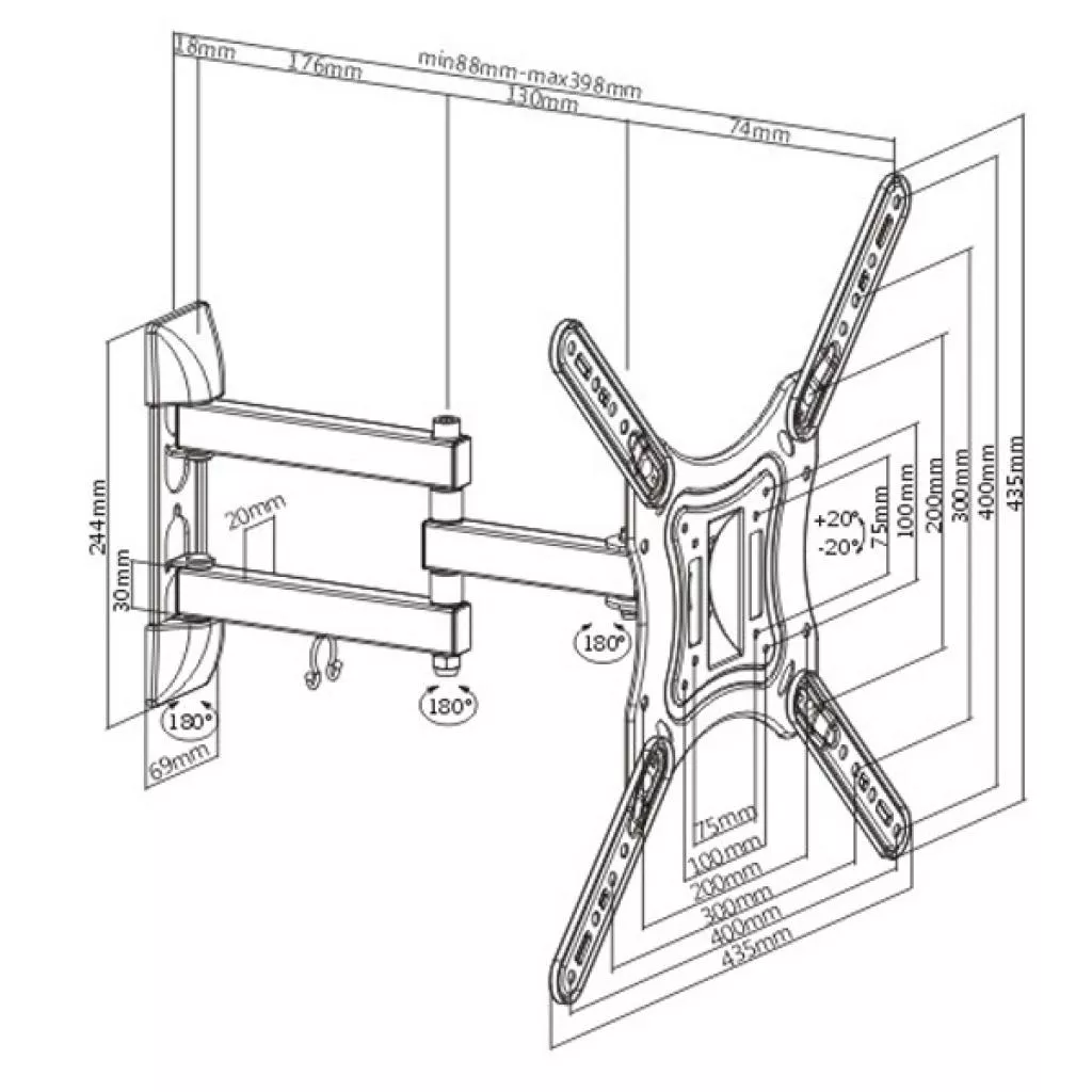 предназначен для приспособления 23"-55" плоскопанельных телевизоров до 30 кг. Простая конструкция кронштейна позволяет легкую установку. Полное движение позволяет максимальную гибкость — удлинение наклона и поворота вашего телевизора до 398мм от стены в каждом направлении для удобного просмотра с любого места в комнате. Кабельные зажимы включенными держать кабели организованы. VESA совместимый со 75х75, 100х100, 200х100,200 х200,400х200, 300х300, 400х400.