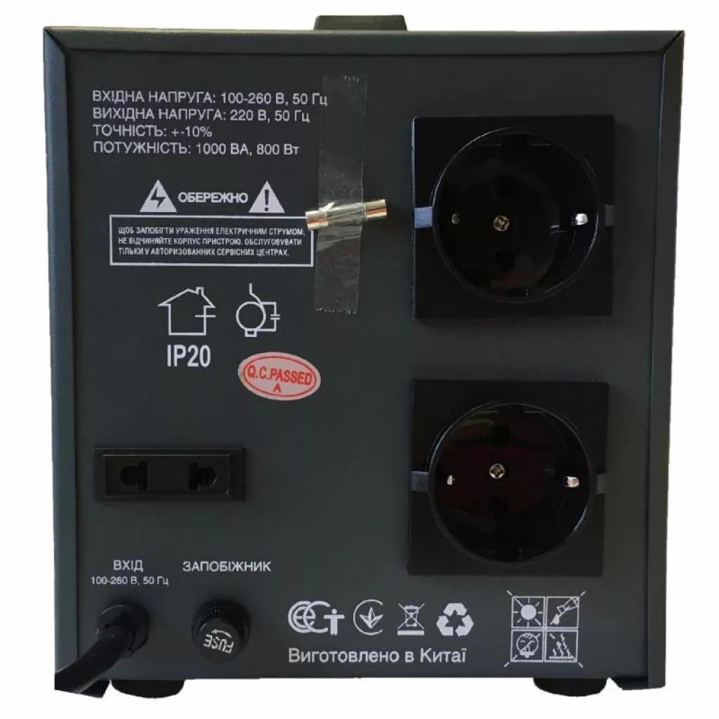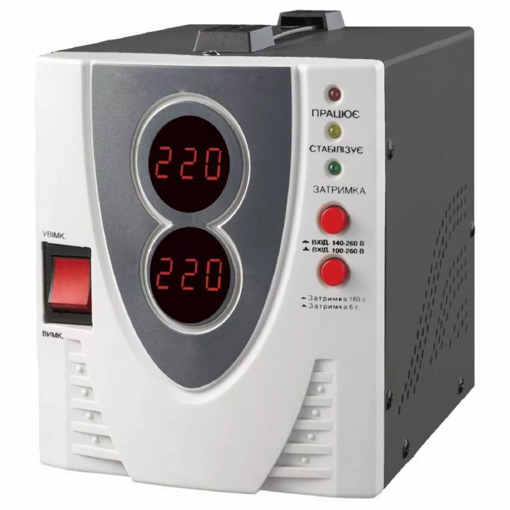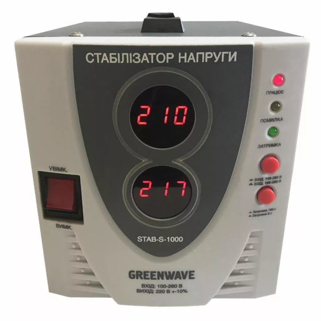 Особенности стабилизатора Greenwave STAB-S-1000: Мощность: 800 Вт. Рабочий диапазон: 100–260 В. Точность: ±10%. Два вольтметра для индикации входного и выходного напряжения. Защита от высокого/низкого напряжения, защита от перегрева. Задержка включения потребителей для защиты после отключения электричества. Одна заземленная и одна незаземленная розетка. Запасной предохранитель в комплекте.