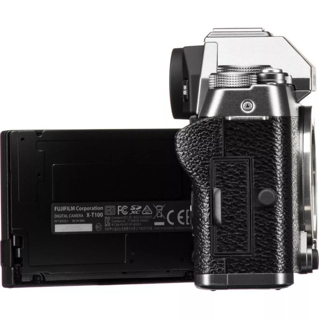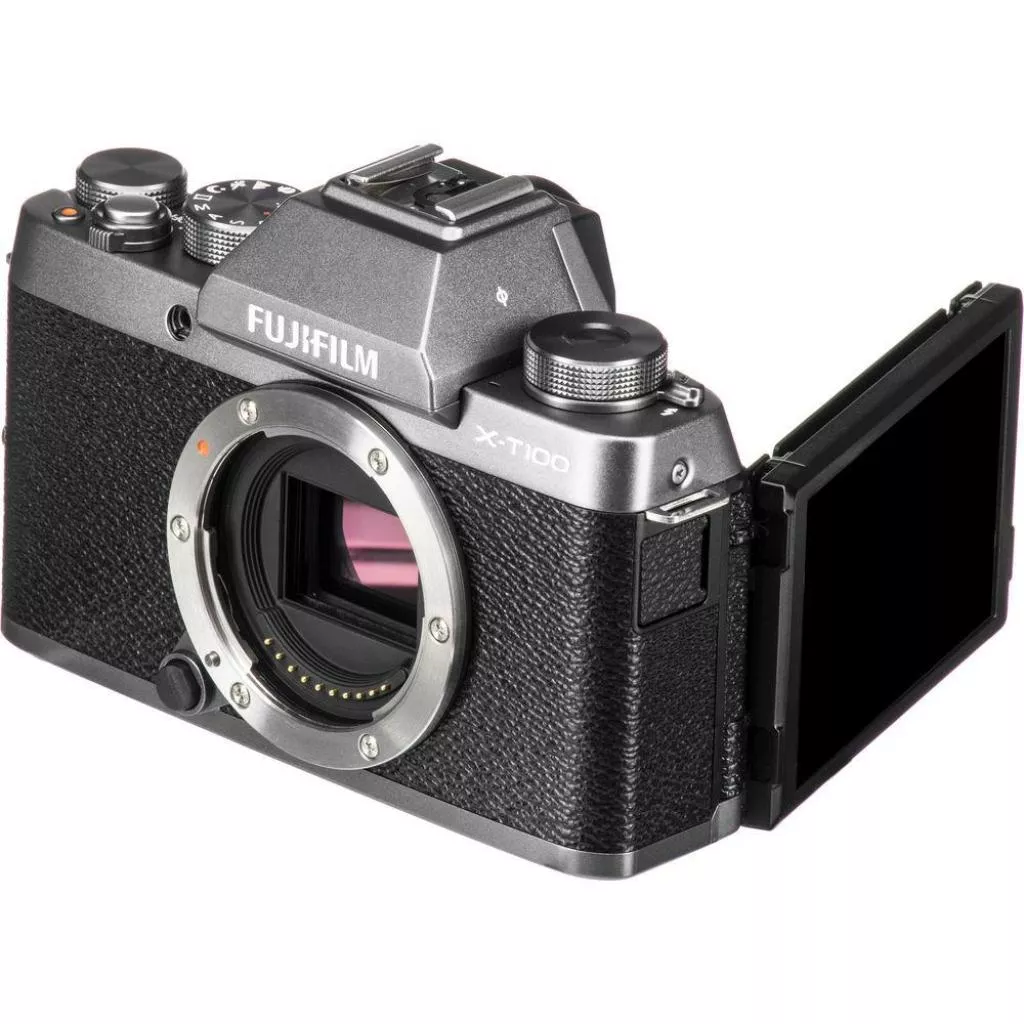 Фотокамера FUJIFILM X-T100 весит всего 448 грамма верхняя алюминиевая панель с анодированным покрытием придает ей роскошный винтажный вид. Корпус фотокамеры X-T100 предлагается в трех цветах: «темное серебро» (Dark Silver), «черный» (Black) и «золотистое шампанское» (Champagne Gold); при этом камера сохранила знакомый дизайн фотоаппаратов популярной X-T серии от Fujifilm с тремя переключателями режимов на верхней панели.