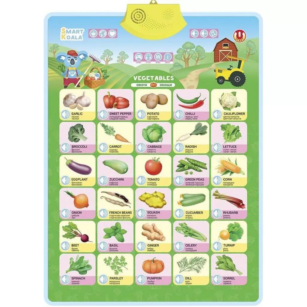 Интерактивный учебный аудиопостер "Овощи" для малышей и дошкольников. Идеально подходит для первого учебного опыта. Цветной привлекательный дизайн заинтересует и привлечет к часам веселого обучения ваших детей. Просто нажмите на изображение и кнопки, и начнется веселый учебный процесс.