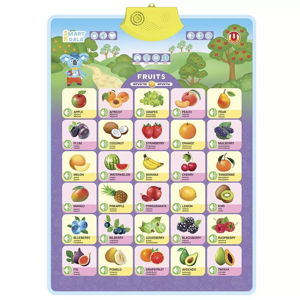 Интерактивный учебный аудиопостер "Фрукты" для малышей и дошкольников. Идеально подходит для первого учебного опыта. Цветной привлекательный дизайн заинтересует и привлечет к часам веселого обучения ваших детей. Просто нажмите на изображение и кнопки, и начнется веселый учебный процесс.