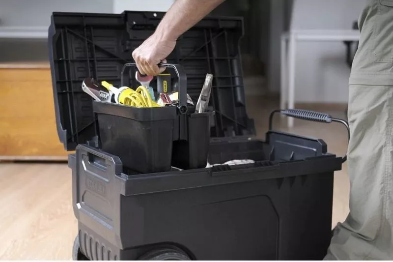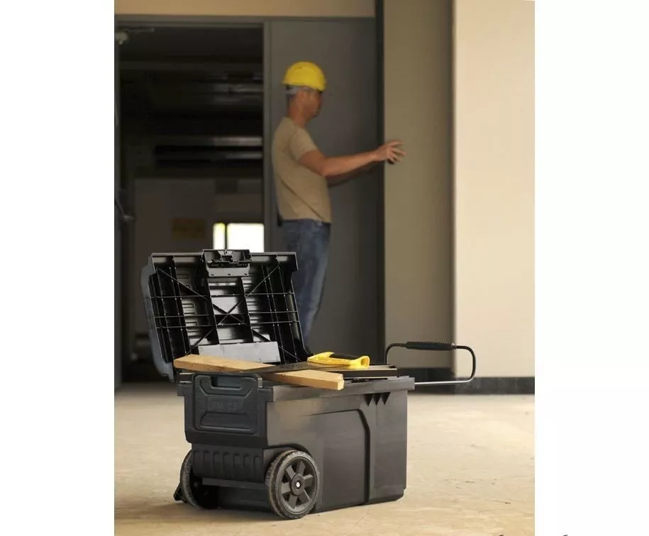 Ящик большого объема с колесами STANLEY Line Contractor Chest STST1-70715 1-70-715 сделан из прочной пластмассы. Применяется в профессиональной сфере для хранения и транспортировки ручного и электрического инструмента. Сверху под прозрачной крышкой есть отделение для хранения мелочей, необходимых в работе. Внутри находится переносной лоток. Ящик удобно перемещать по рабочей площадке благодаря колесам и выдвижной металлической ручке. Для быстрого доступа к содержимому предусмотрен замок, который открывается и закрывается одной рукой. Ящик отличается вместительностью, помогает держать необходимые инструменты под рукой.