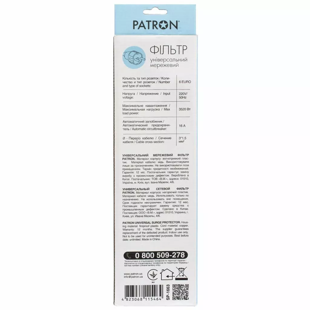 Сетевой фильтр Patron предназначен для подключения широкого спектра бытовой и компьютерной техники. Фильтр имеет универсальные розетки типа "евро" с заземлением и защищает электронную технику от короткого замыкания, перепадов напряжения и импульсных помех.
