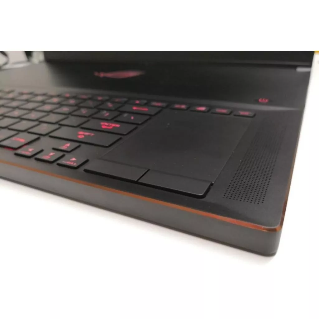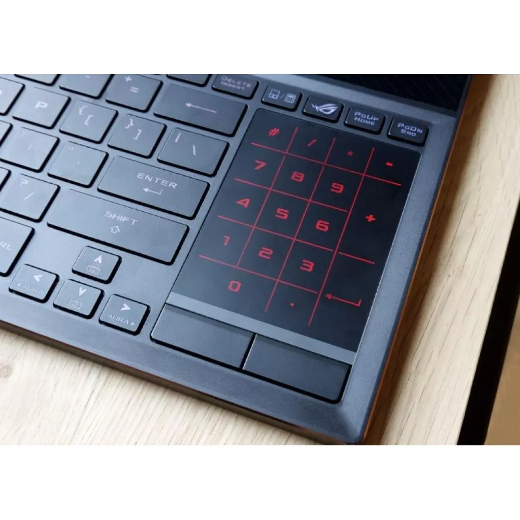 Клавиатура ноутбука ROG Zephyrus S размещена в передней части корпуса, ближе к рукам пользователя, чтобы поверхность вокруг нее оставалась более прохладной. Она оснащена подсветкой Aura, которую можно гибко настраивать для каждой клавиши и синхронизировать с Aura-совместимыми периферийными устройствами (технология Aura Sync). Кроме того, подсветка расширена на колесико регулятора громкости и на цифровой клавиатурный блок, который отображается на тачпаде.