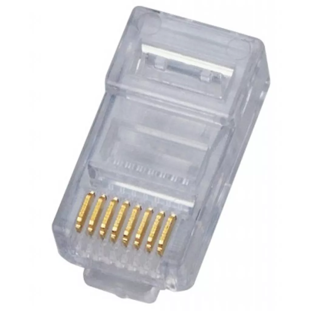 Коннектор является разъемом типа 8Р8С. Изготовлен из качественного пластика прозрачного цвета и имеет золотое напыление на ножах-контактах для улучшения контакта с жилами кабеля.