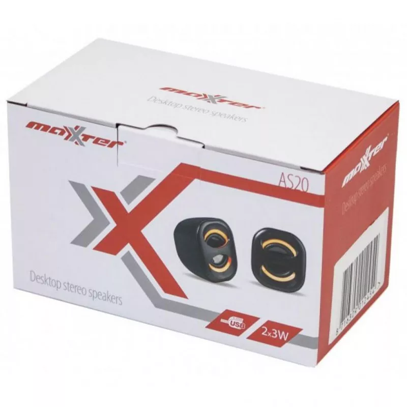 Акустическая система Maxxter AS20Y - это стильная и компактная стерео система, которая не займет много места и удобна для переноски вместе с вашим ноутбуком. Спереди динамик, обрамленный оранжевым кругом, а сам он перекрывается посередине перемычкой с логотипом производителя. Сзади корпус глянцевый, но при этом колонка не выскальзывает из рук. Благодаря стильному цвету АS20 может вписаться в любой современный интерьер. Подключать ее к сети 220В не нужно, так как она питается от порта USB, так что можно ее использовать и на природе вместе с вашим ноутбуком. Аудио штекер имеет стандартный размер 3.5 мм. Акустическая система Maxxter AS20 выдает звук лучше любых встроенных динамиков большинства ноутбуков, а самое главное – они мощнее.