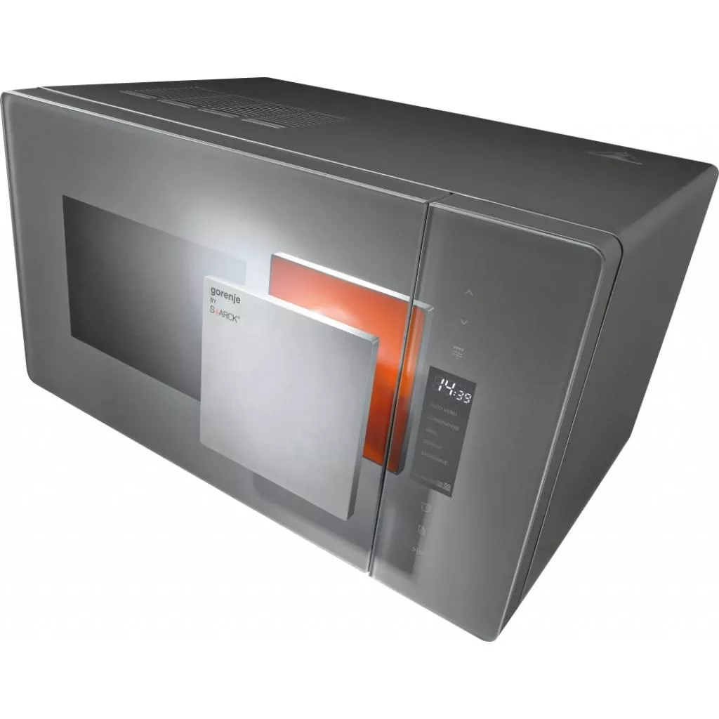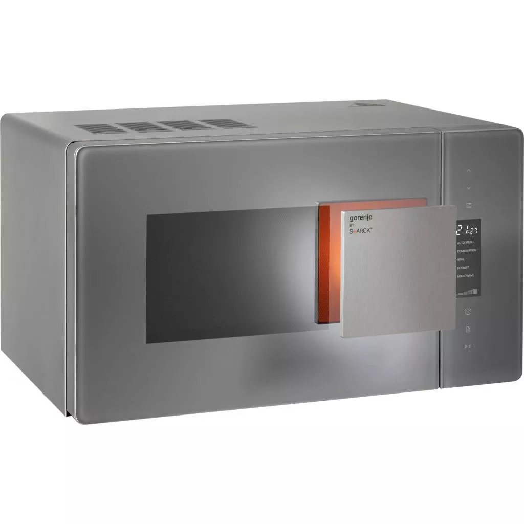 оснащена грилем, а также имеет 5 уровней мощности. Доступно 8 программ меню автоматического приготовления и функция размораживания по весу. Внутренняя камера из нержавеющей стали имеет объем 23 литра. Равномерность приготовления обеспечивается поворотной тарелкой диаметром 31,5 см. Для контроля за процессом приготовления имеется освещение. Для безопасности предусмотрена блокировка от детей и прекращение работы при отрывании дверцы. В комплект входит решетка для гриля.
