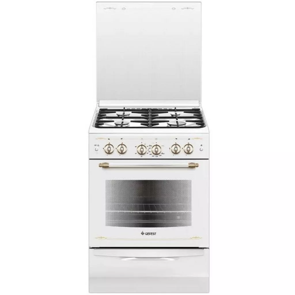 Особенности и функции. Полезный объем духовки GEFEST составляет 52 л. Газовая плита оснащена гриль горелкой, что позволит приготовить блюдо с румяной и хрустящей корочкой. Рельефные направляющие легко чистить и на них удобно переставлять решетки.